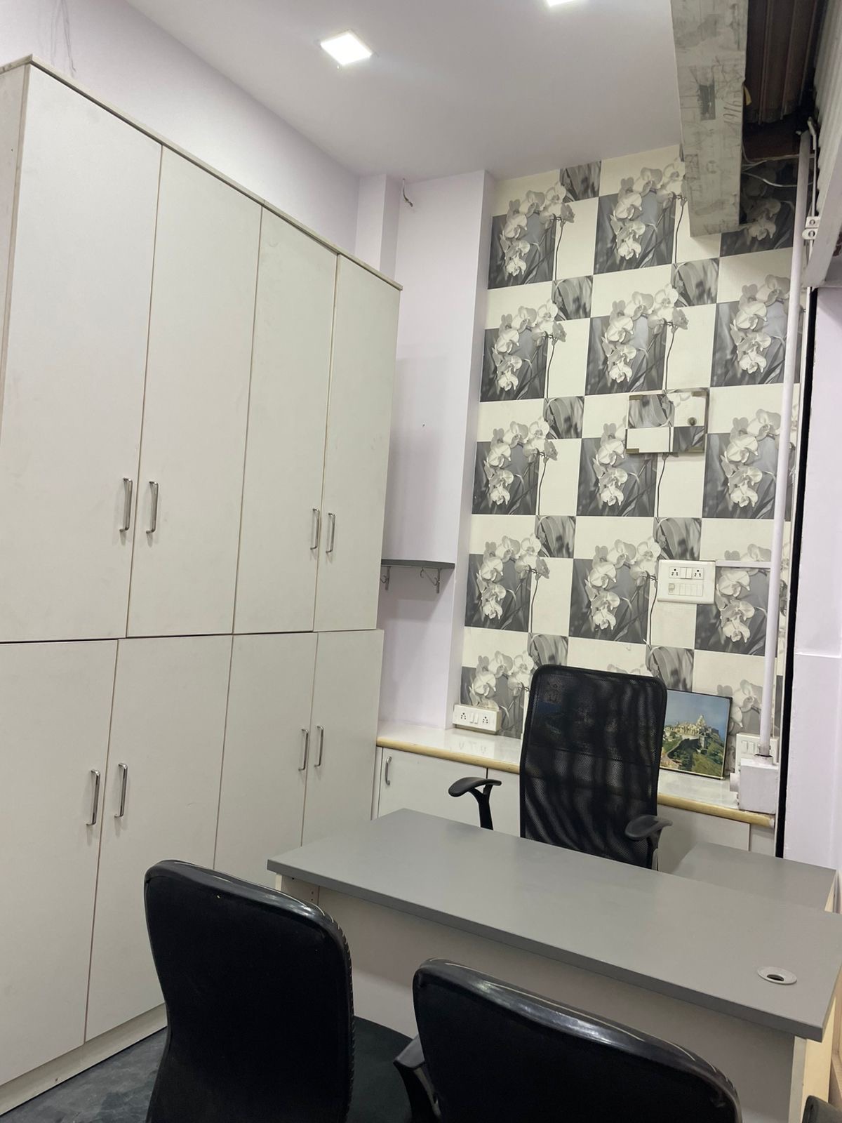 This furnished office space in Mulund West, Mumbai, offers a prime location on the main road with a road view from the second floor.
