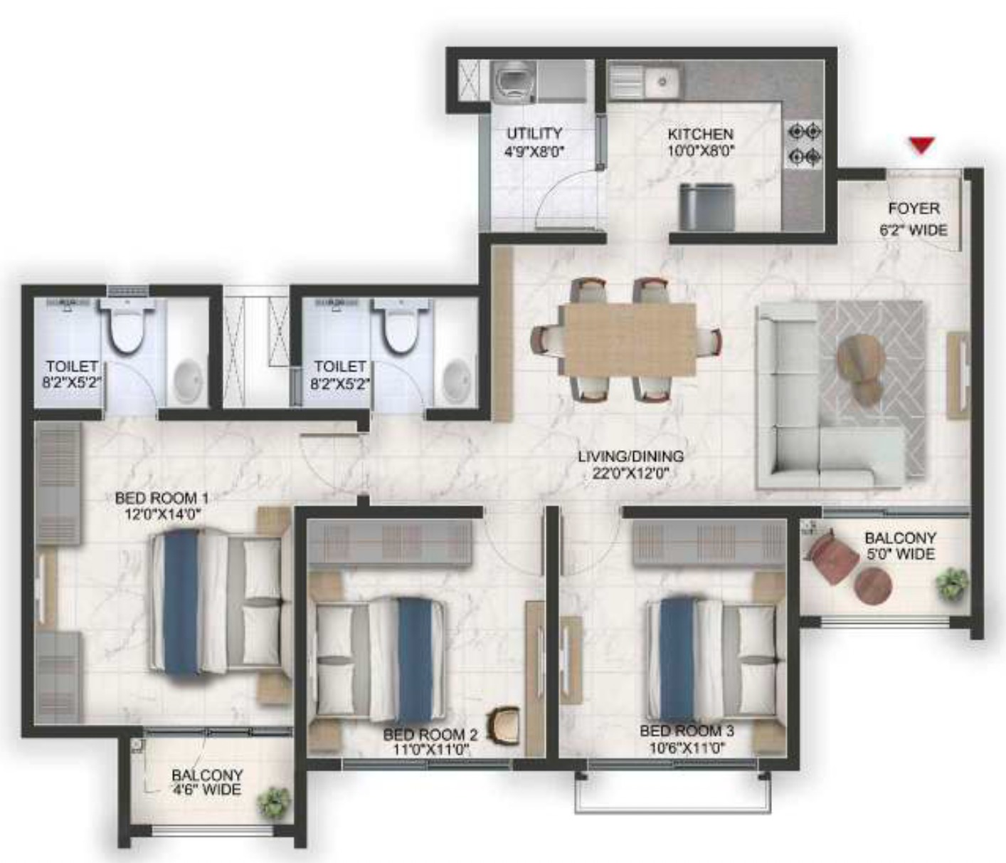 This spacious 1935 square feet Flats in Marathahalli ORR offers a comfortable lifestyle for families, featuring 3 bedrooms and 2 bathrooms.