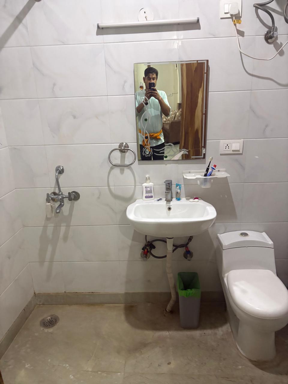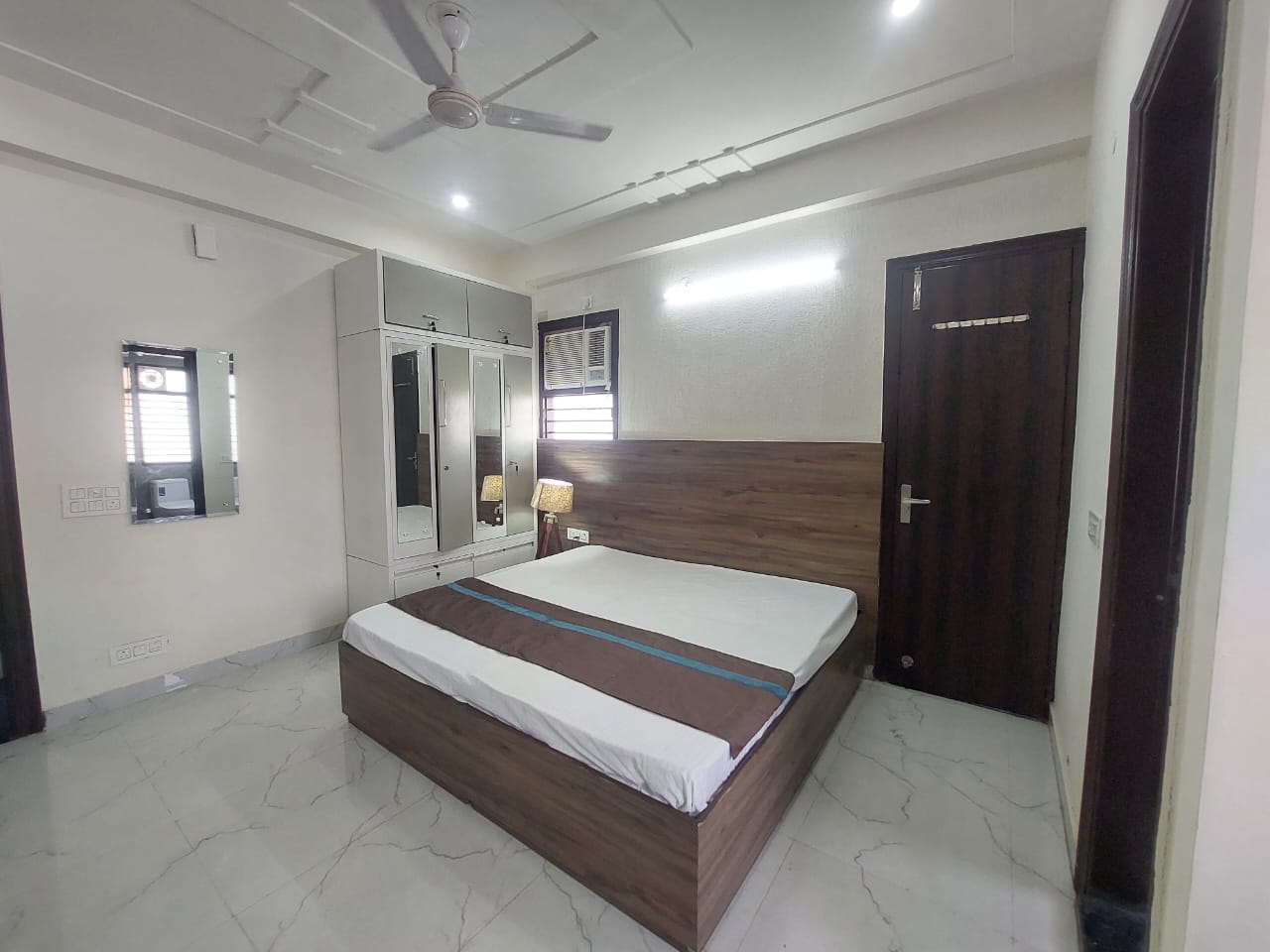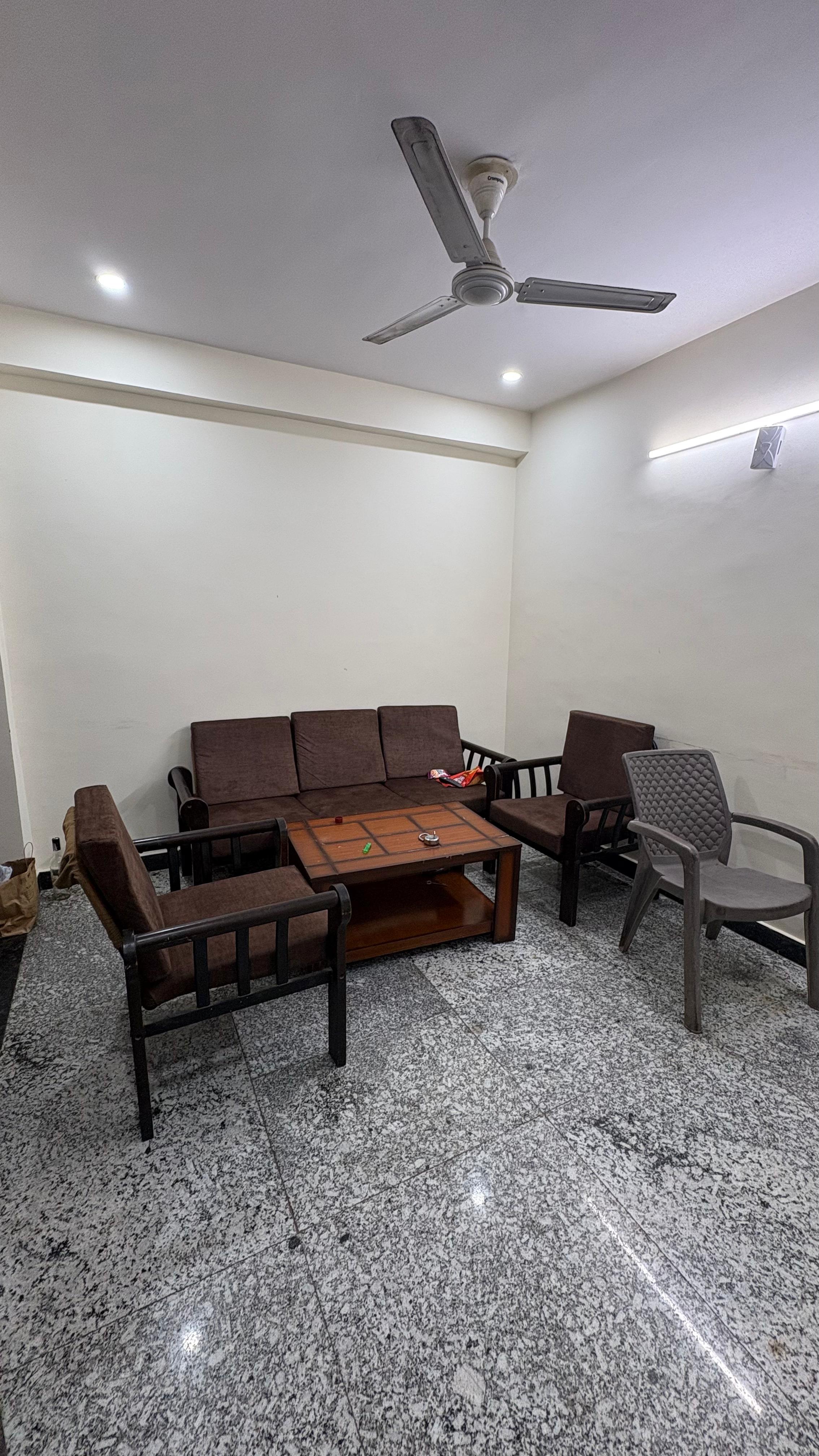 This furnished one-room-kitchen builder floor in Sector 31, Gurgaon, offers a beach view from its second-floor position in a four-story building.