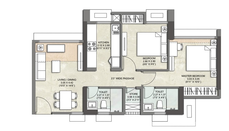 A delightful 2-bedroom, 2-bathroom Flats is available for rent in Thane West, offering a serene garden view from its 5th-floor position in the Rustomjee Azziano Wing D project.
