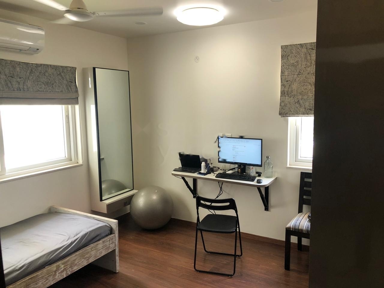 This semi-furnished three-bedroom, three-bathroom Flats in Ayyanna Prestige, Kondapur, offers a comfortable living experience with a peaceful garden view from its fourth-floor position.