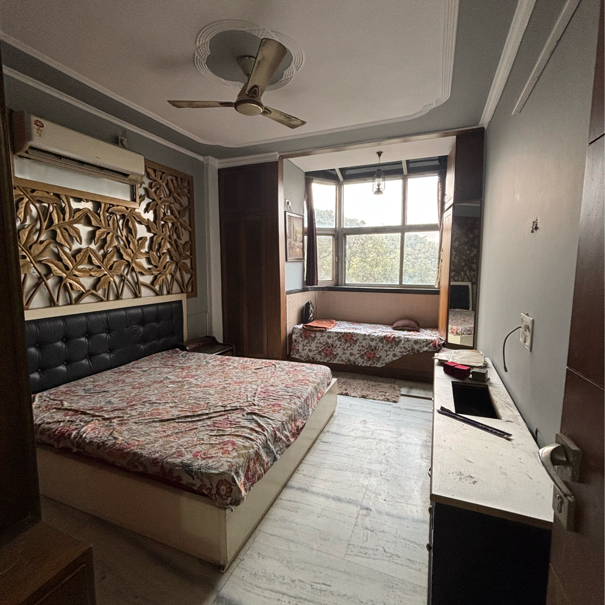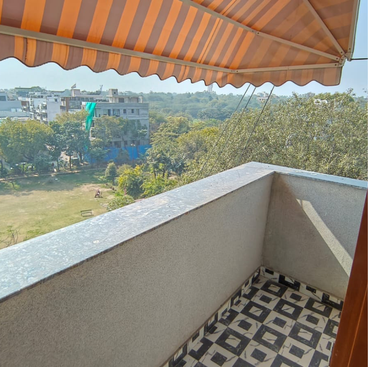 A park view from the fourth floor of this 900 square feet builder floor in Malviya Nagar, Delhi, offers a serene setting for comfortable living.