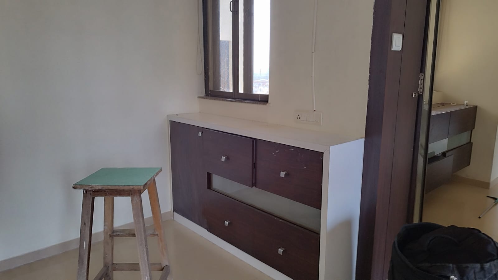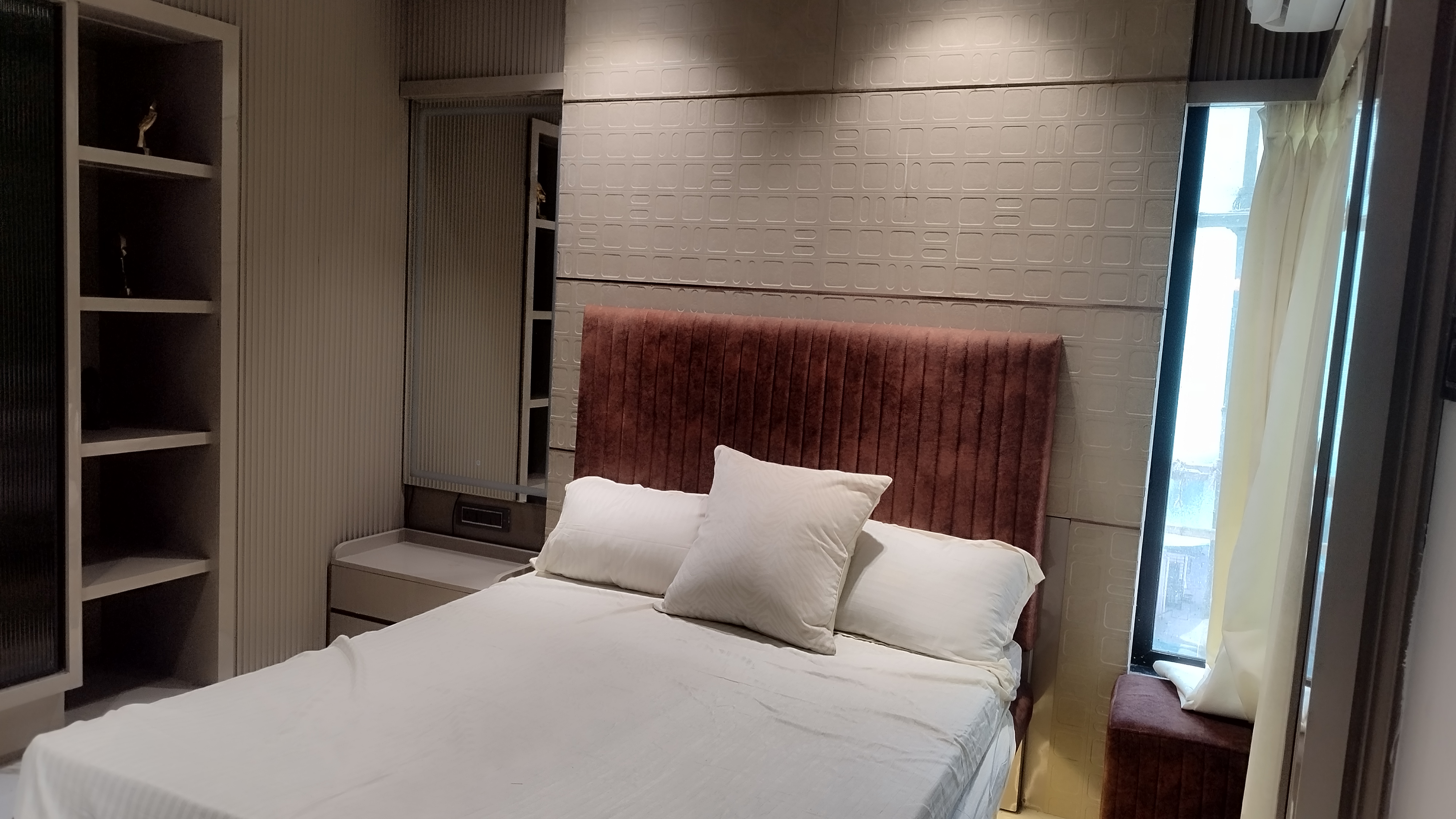 This semi-furnished two-bedroom, two-bathroom Flats in Mira Road offers 1155 square feet of living space on the eleventh floor of an eighteen-story building.