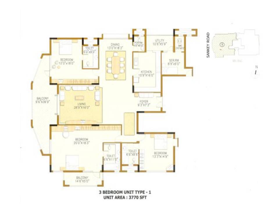 Discover an expansive 3770 square feet, 3-bedroom, 3-bathroom Flats available for rent on the first floor of an 8-story building on Sankey Road, Bangalore.