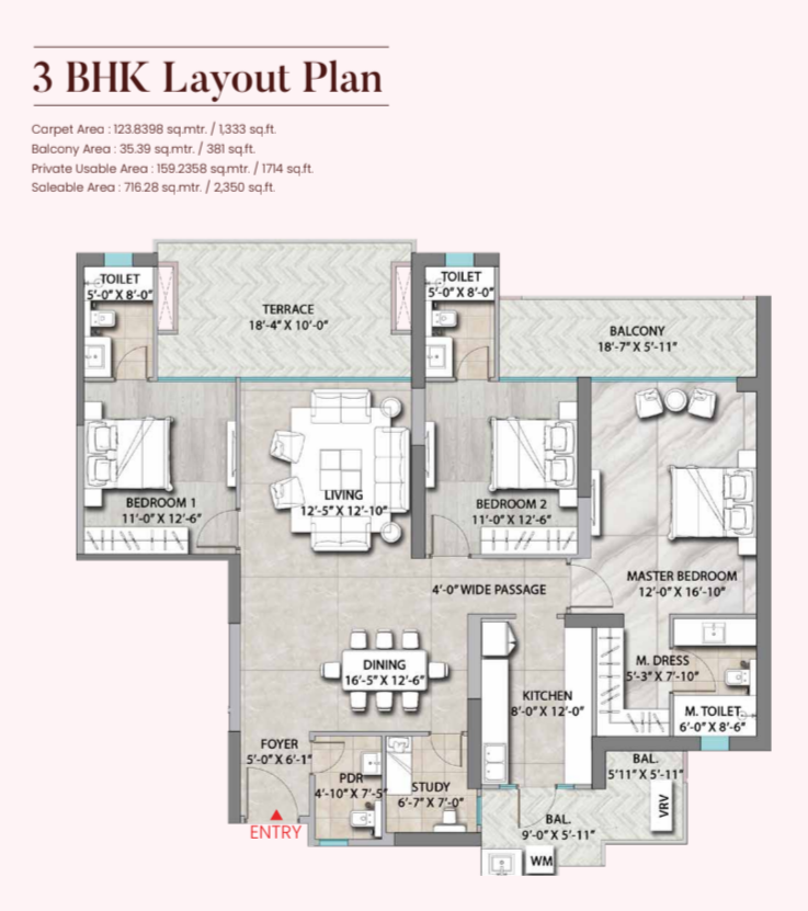 A semi-furnished 3 bedroom, 3 bathroom Flats in Ireo The Corridors, Sector 67A, Gurgaon offers 1727 square feet of living space with a garden view from the 15th floor.