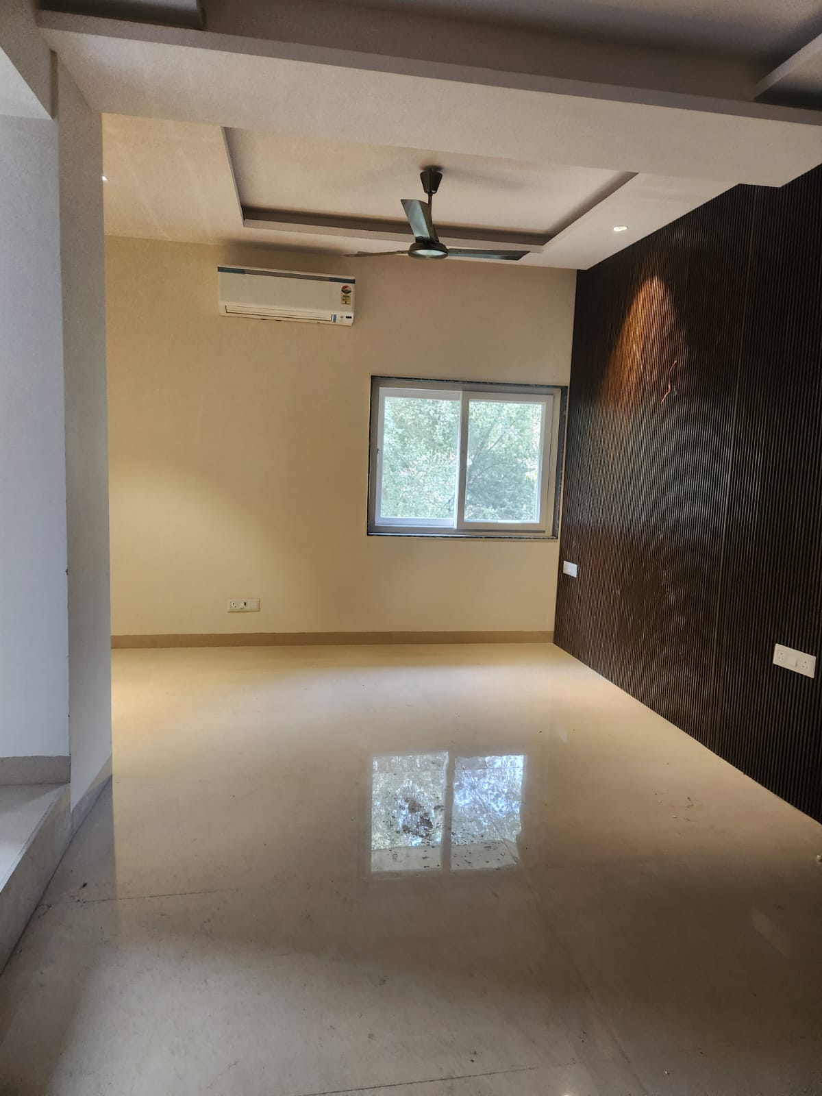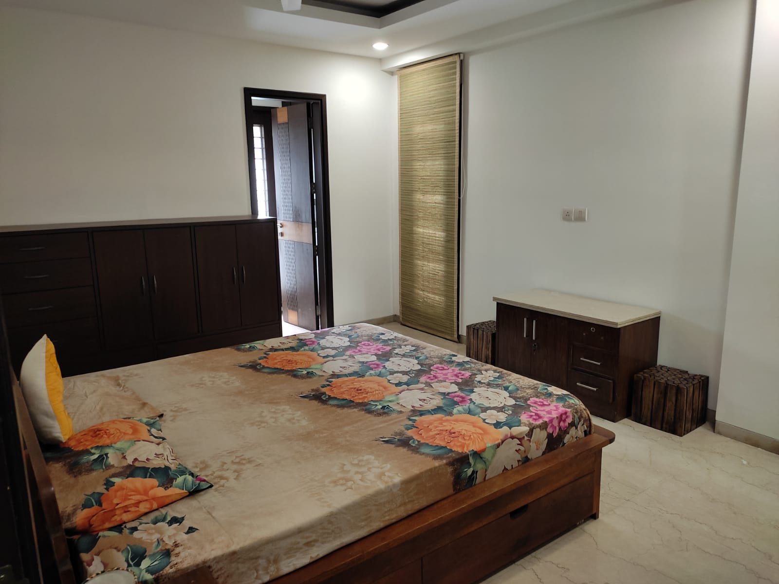 This semi-furnished 3-bedroom, 3-bathroom Flats in Defence Colony, New Delhi, offers 2000 square feet of living space with a pleasant road view from the first floor of a four-story building.