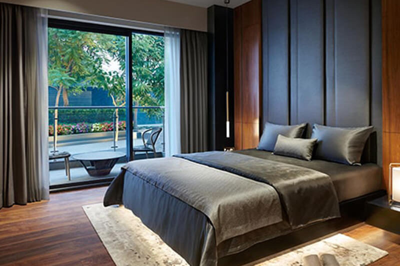A tranquil garden view complements this semi-furnished two-bedroom Flats located on the 16th floor of the Krisumi Waterfall Residences in Gurgaon.