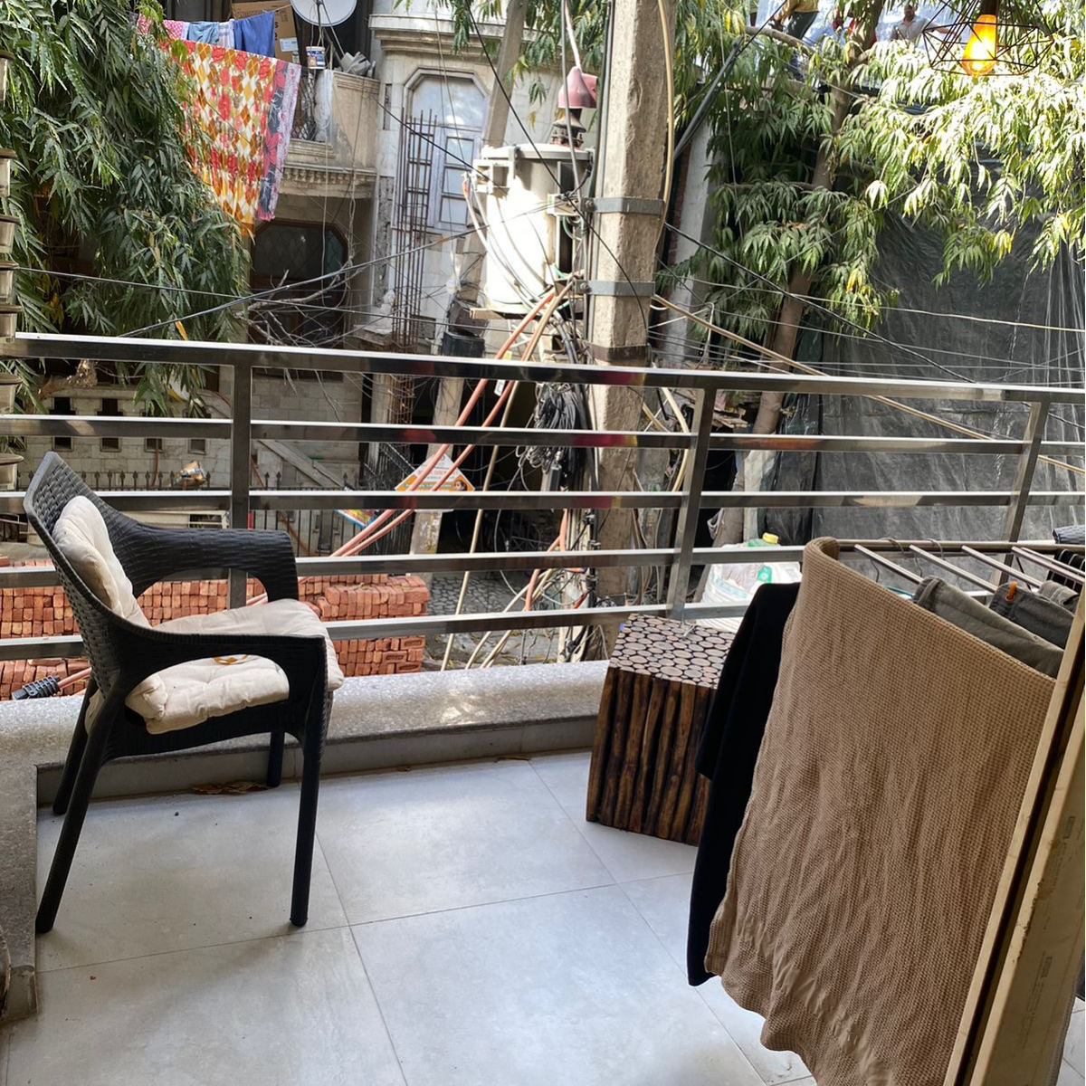 This two-bedroom builder floor in Chattarpur, Delhi, offers a comfortable living experience with plenty of natural light and road views from the second floor of a five-story building.