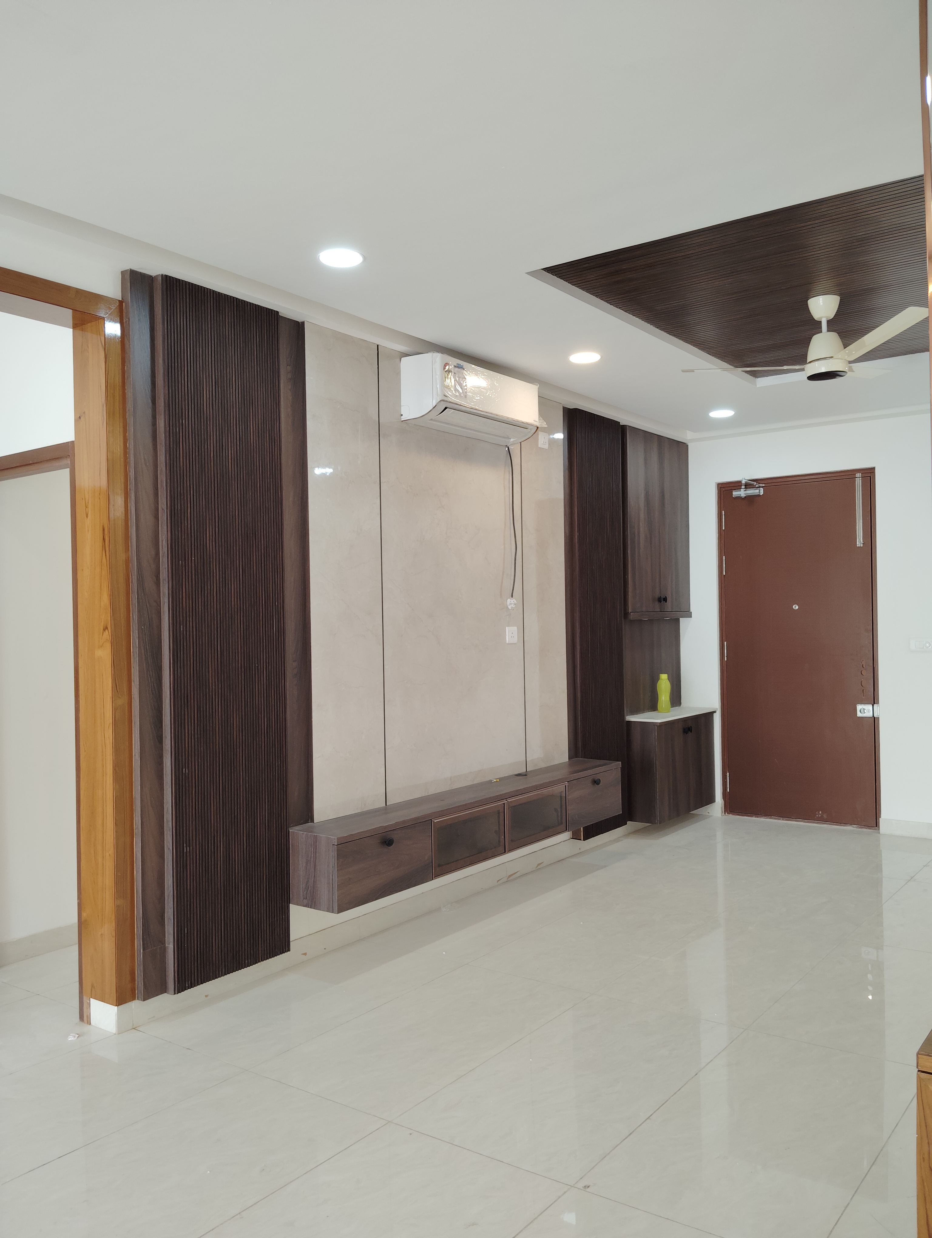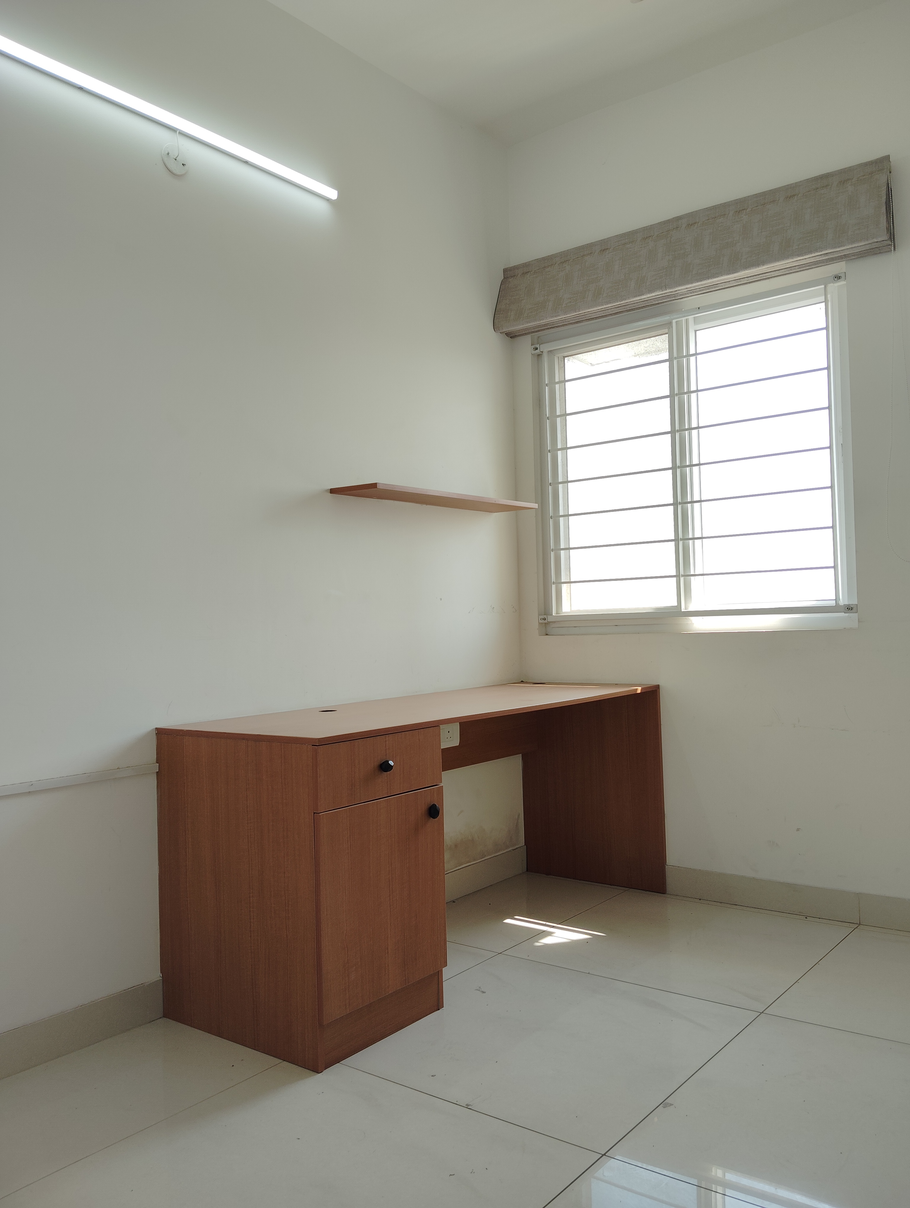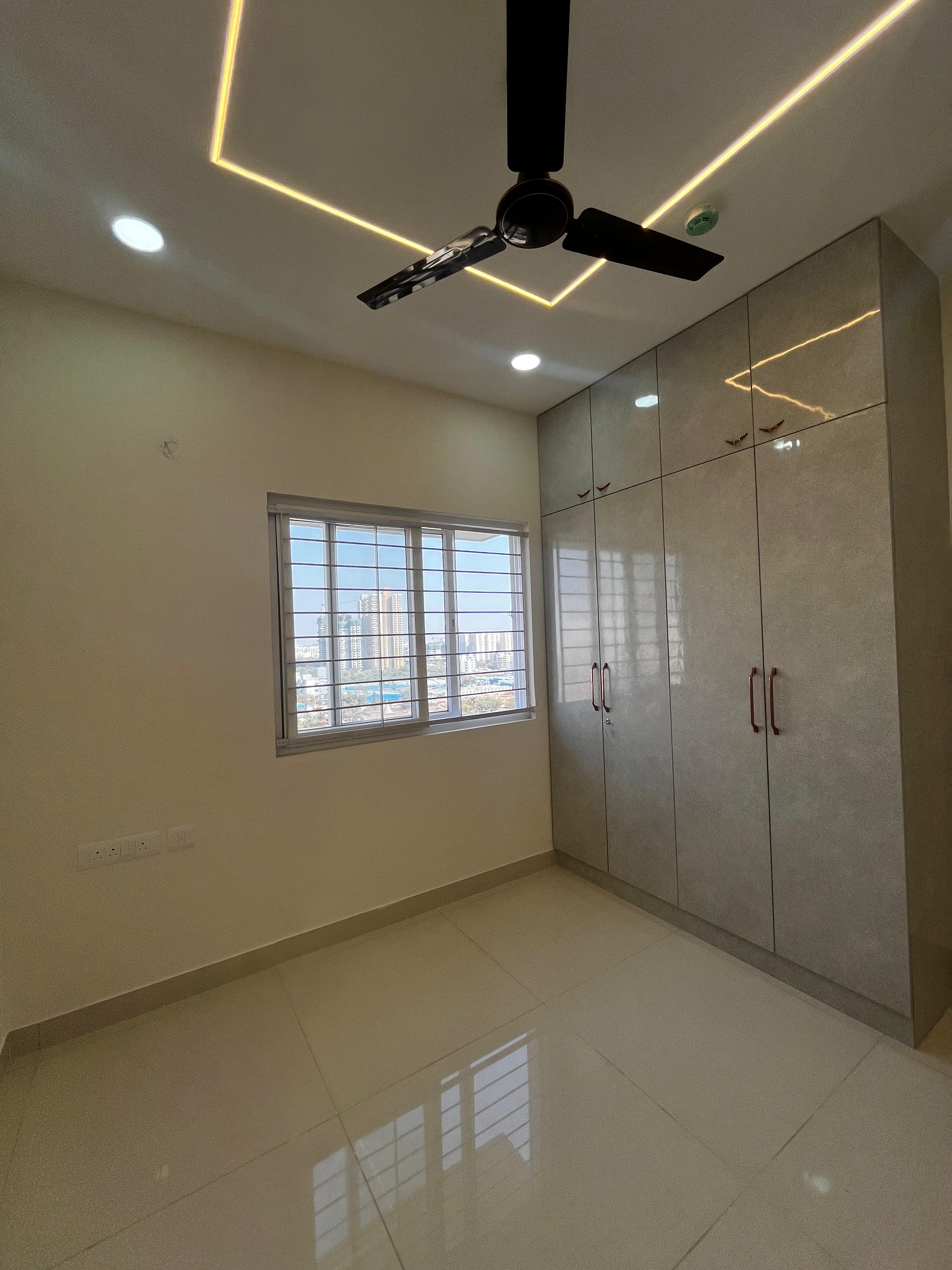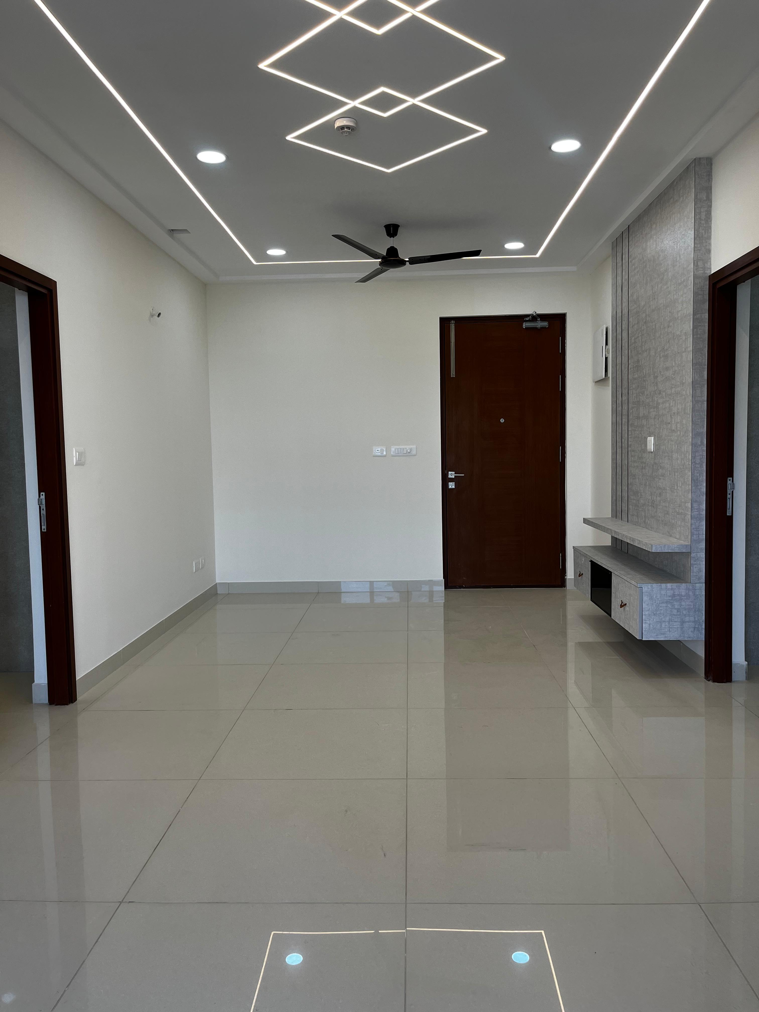 This semi-furnished two and a half bedroom, two bathroom Flats in Prestige Tranquil, Kokapet, Hyderabad, is available for rent at 55,000.
