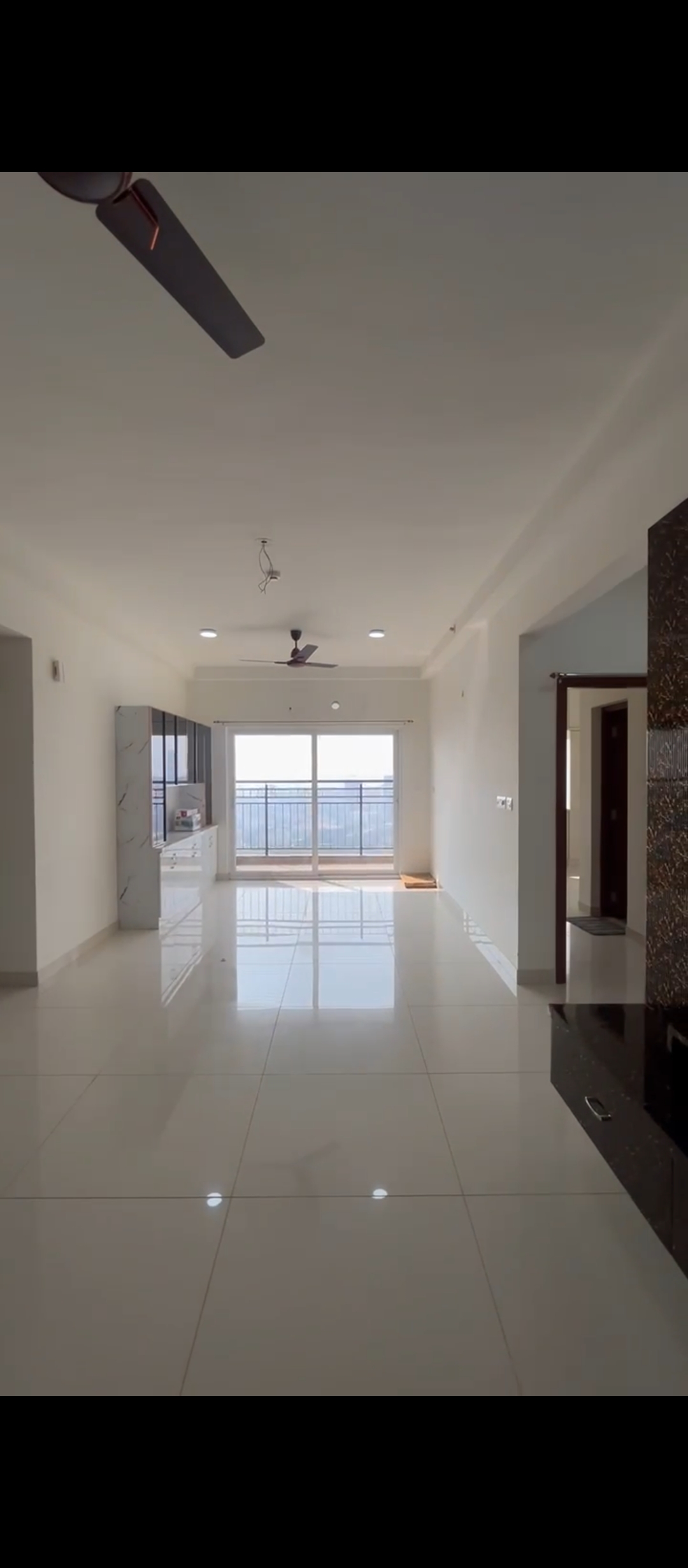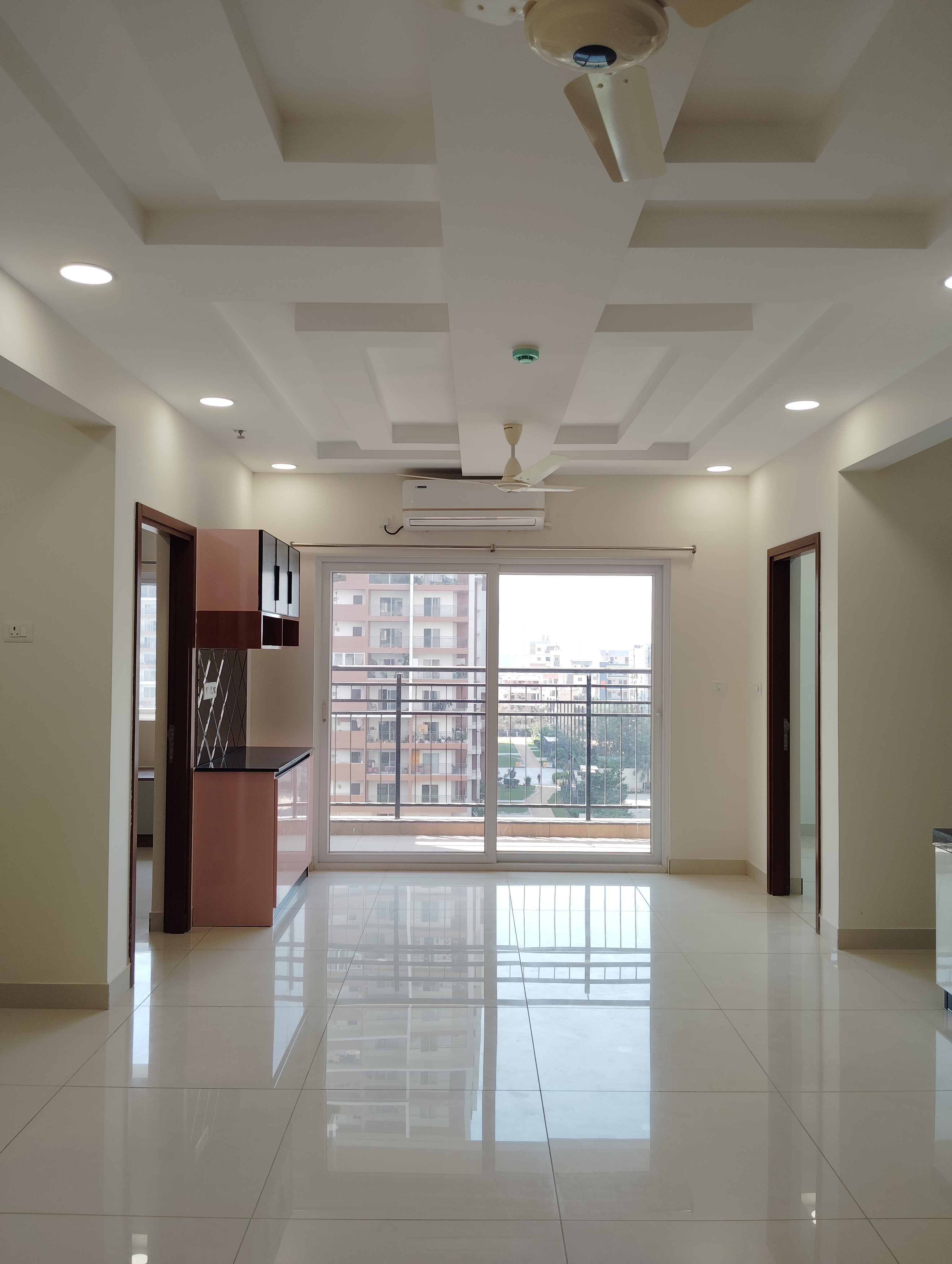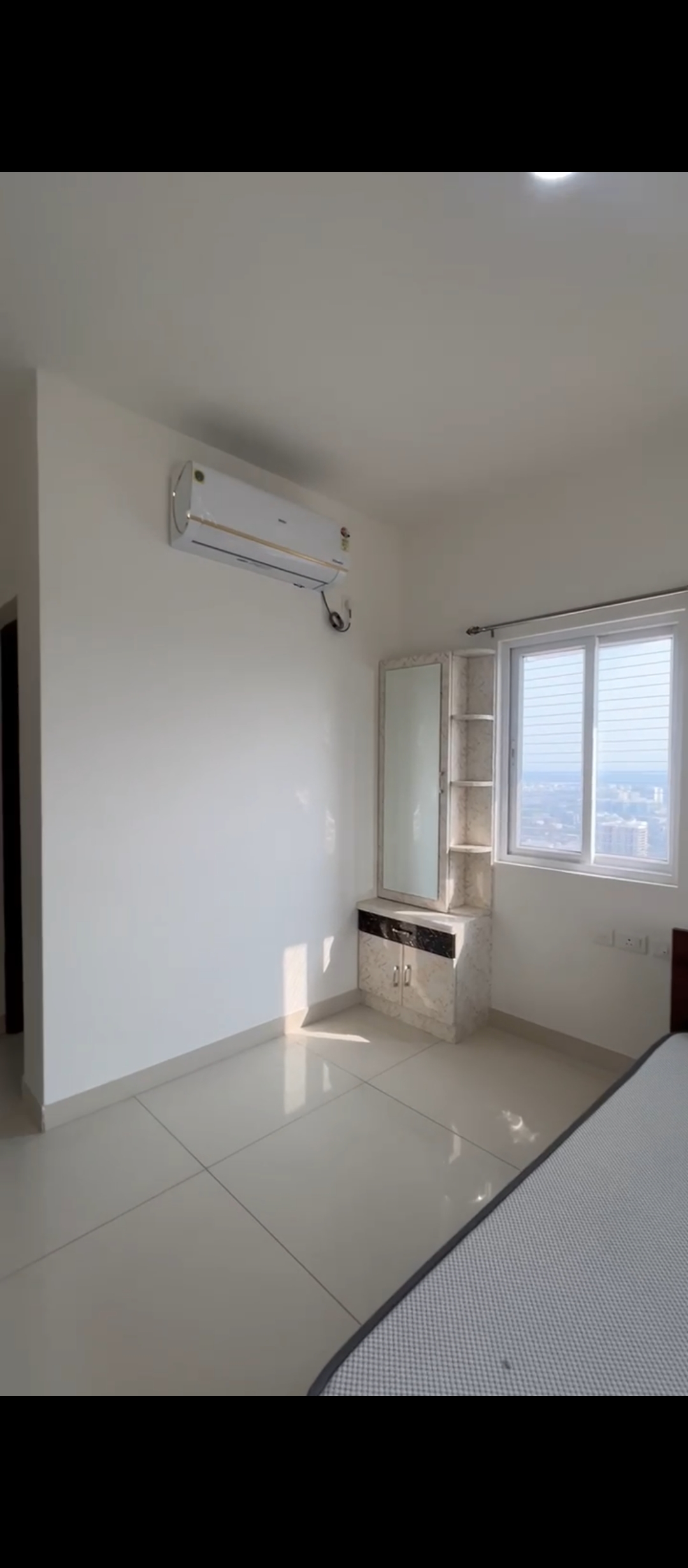 This semi-furnished three-bedroom, three-bathroom Flats in Prestige Tranquil, Kokapet, Hyderabad, offers a lake view from its 28th-floor position in a 34-story building.