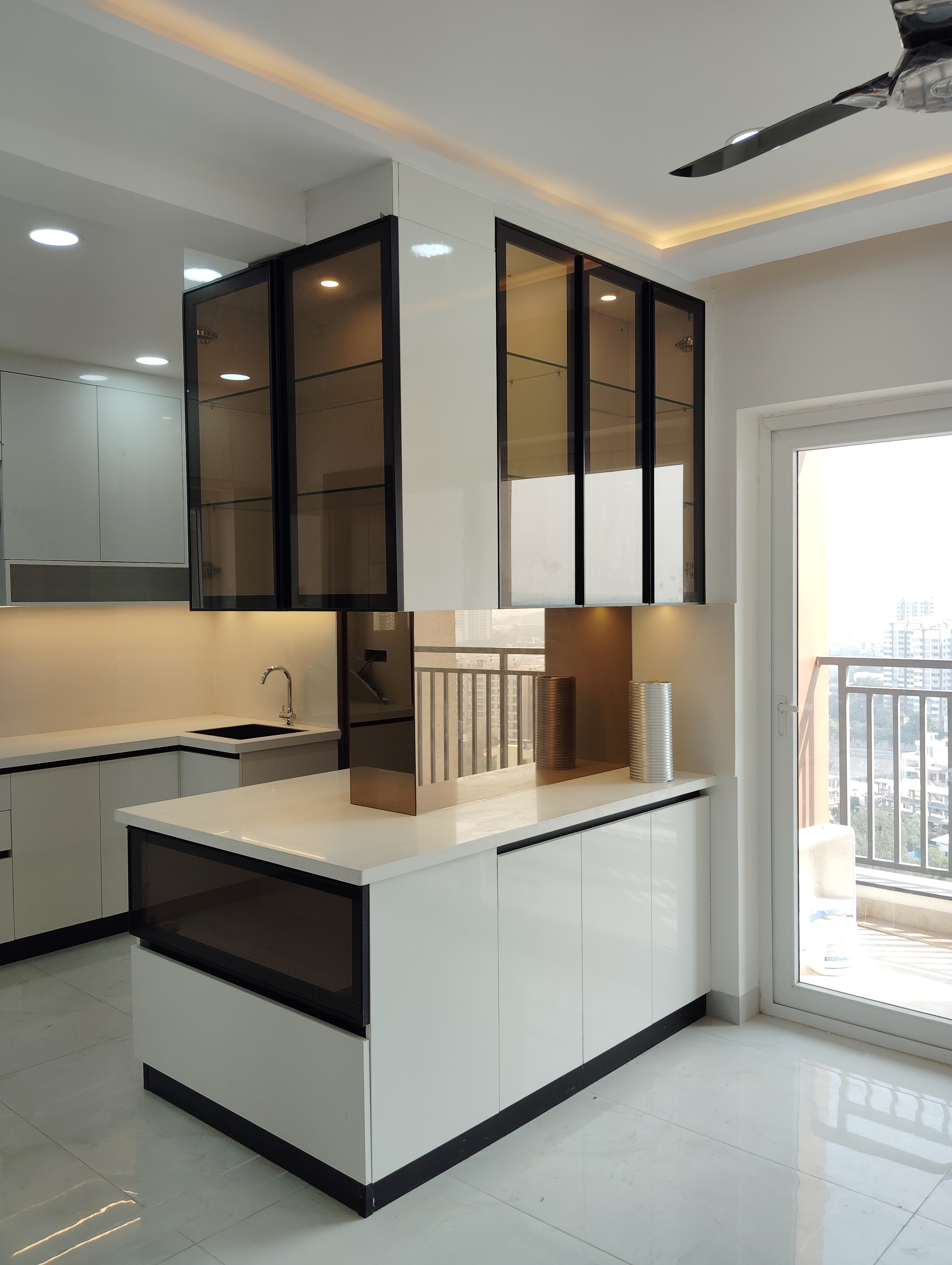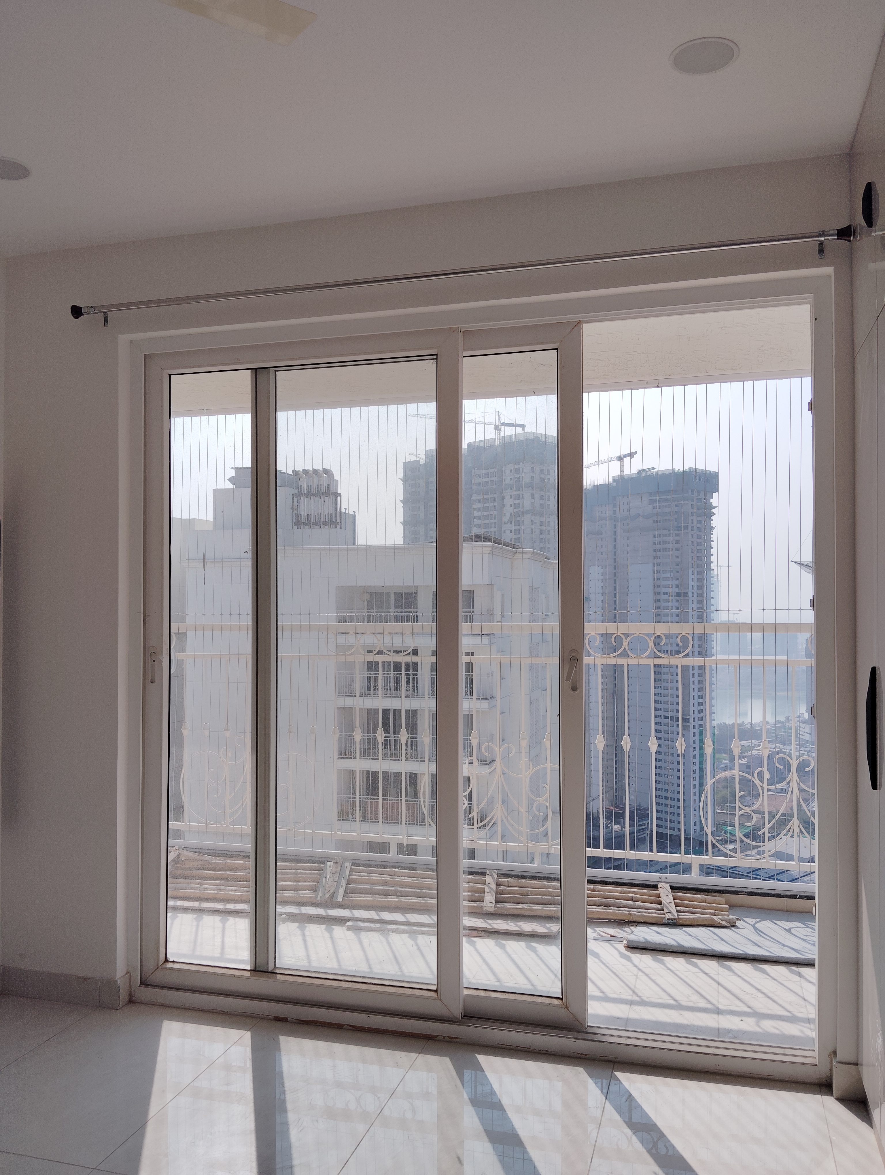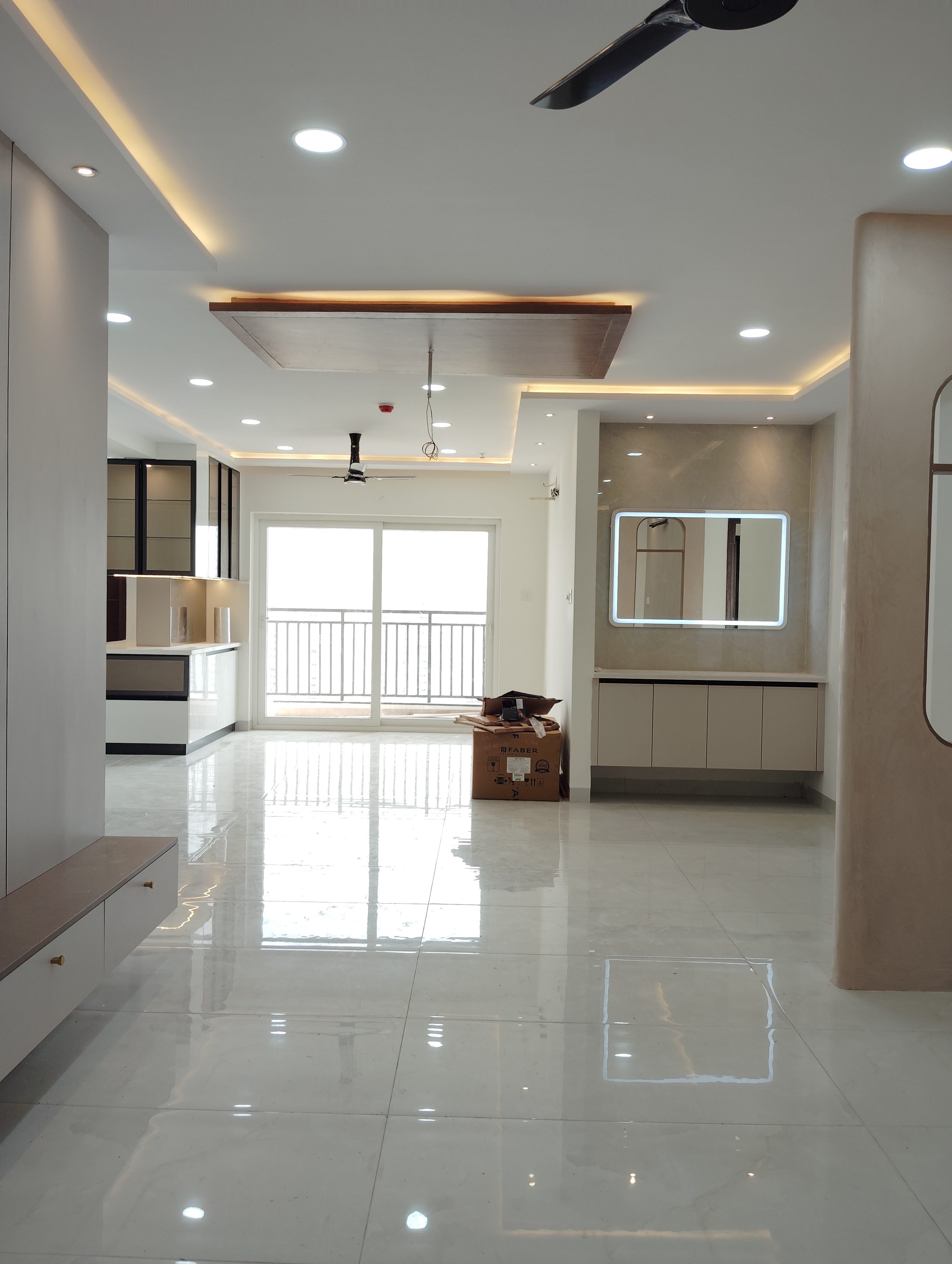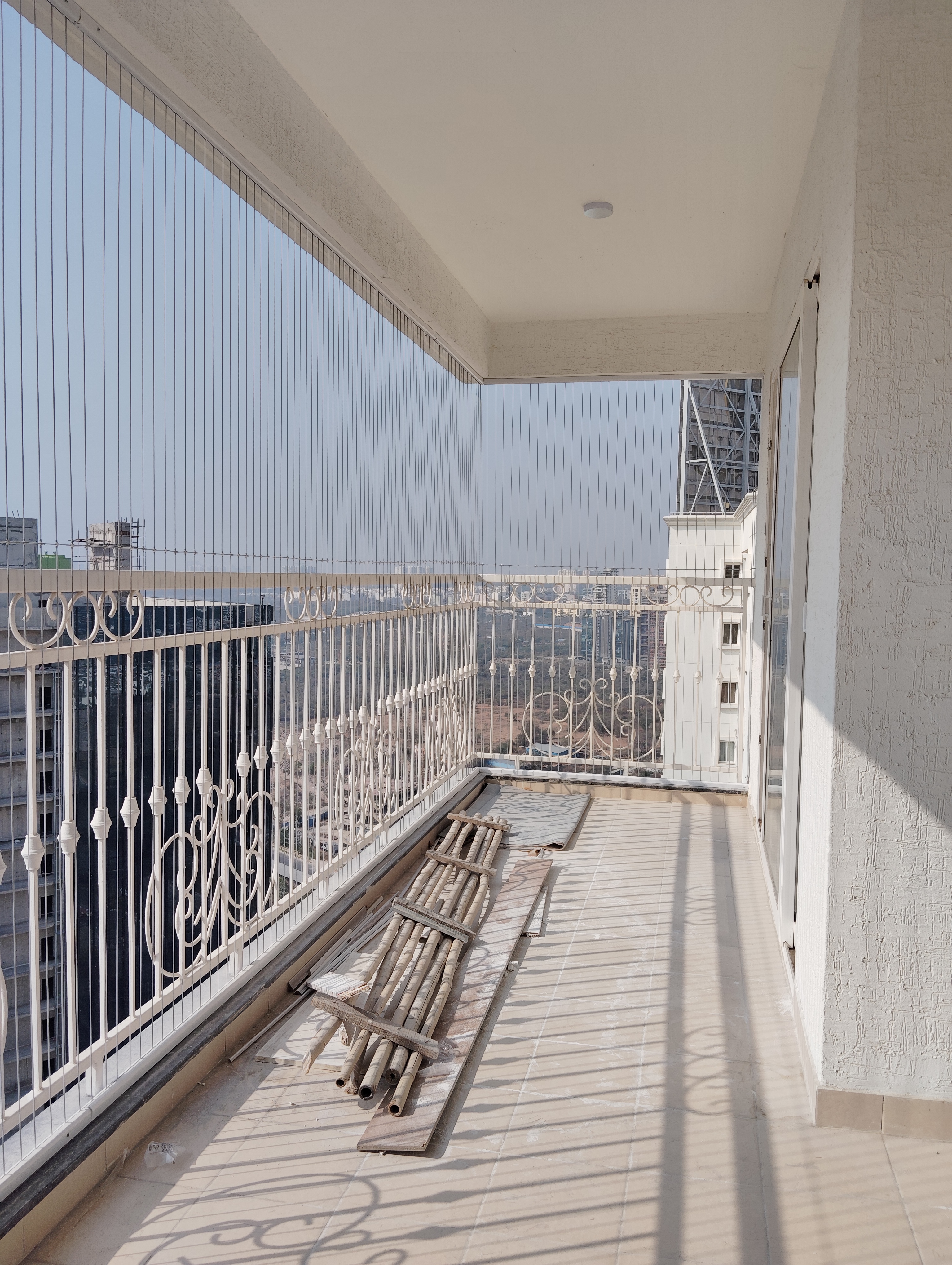 This semi-furnished three-bedroom, three-bathroom Flats in Prestige Tranquil, Kokapet, Hyderabad, offers a lake view from its 28th-floor position in a 34-story building.