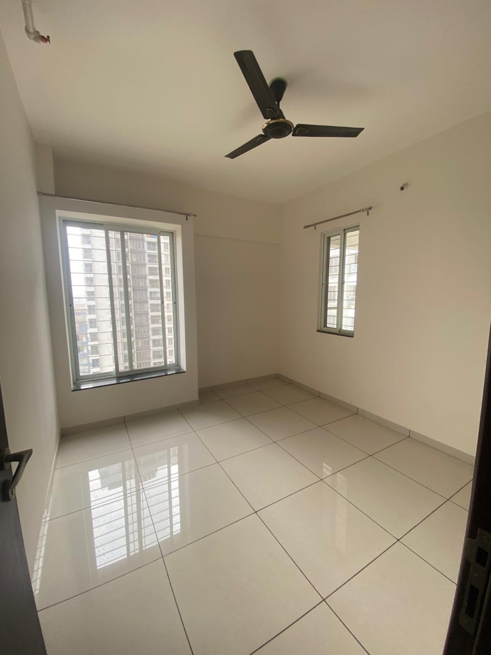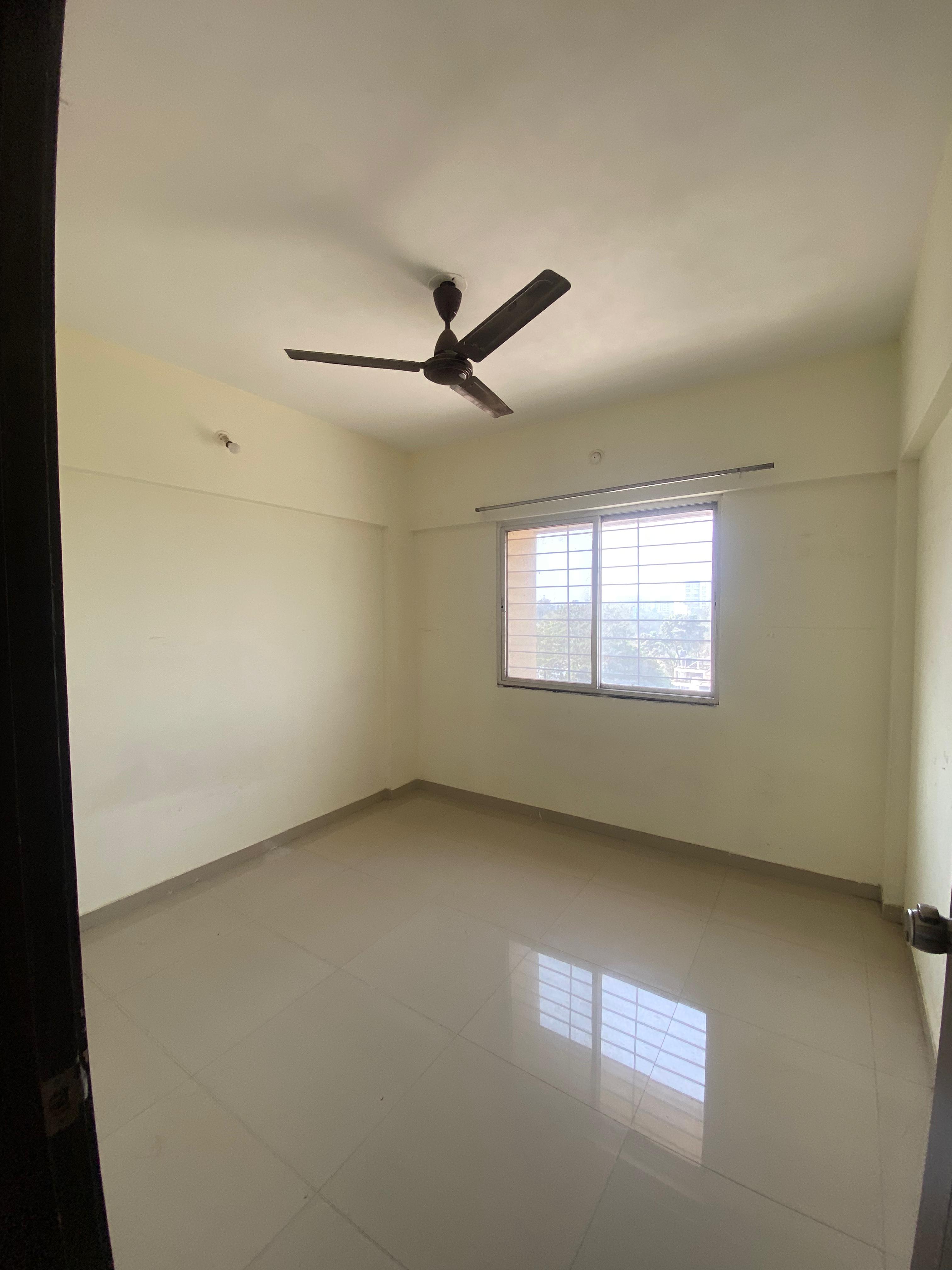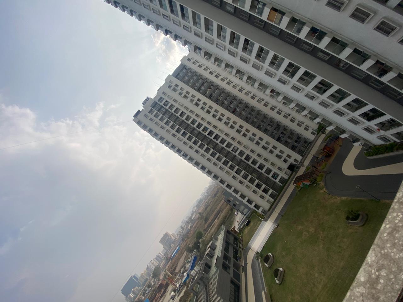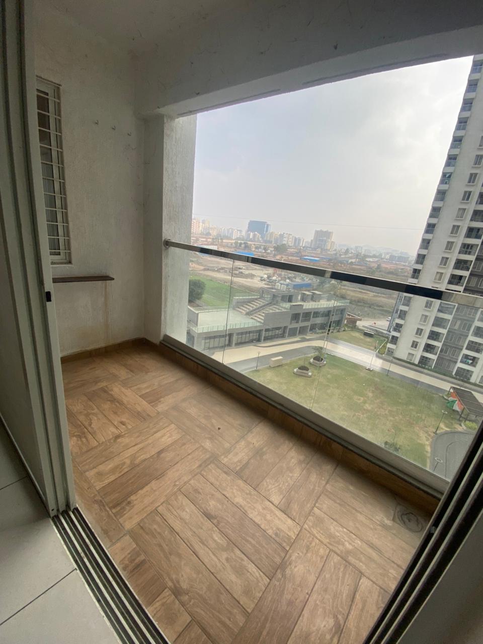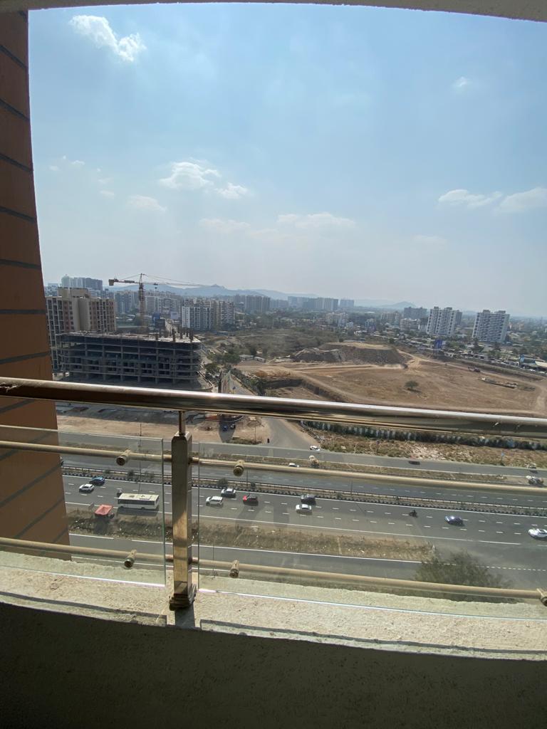 This semi-furnished 2-bedroom Flats in Tathawade, Pune, offers comfortable living with garden views from its ninth-floor balcony.