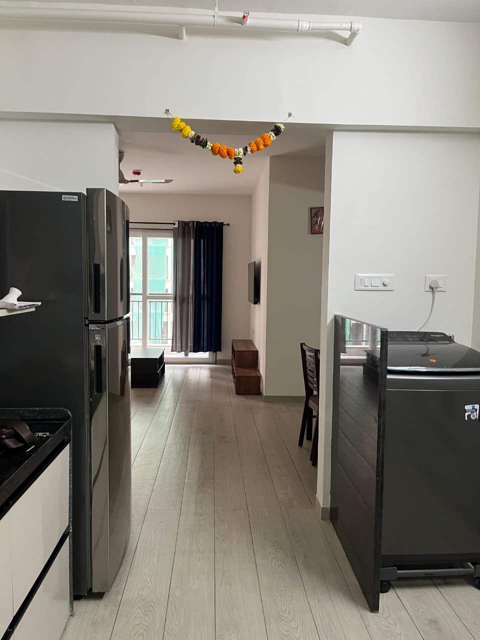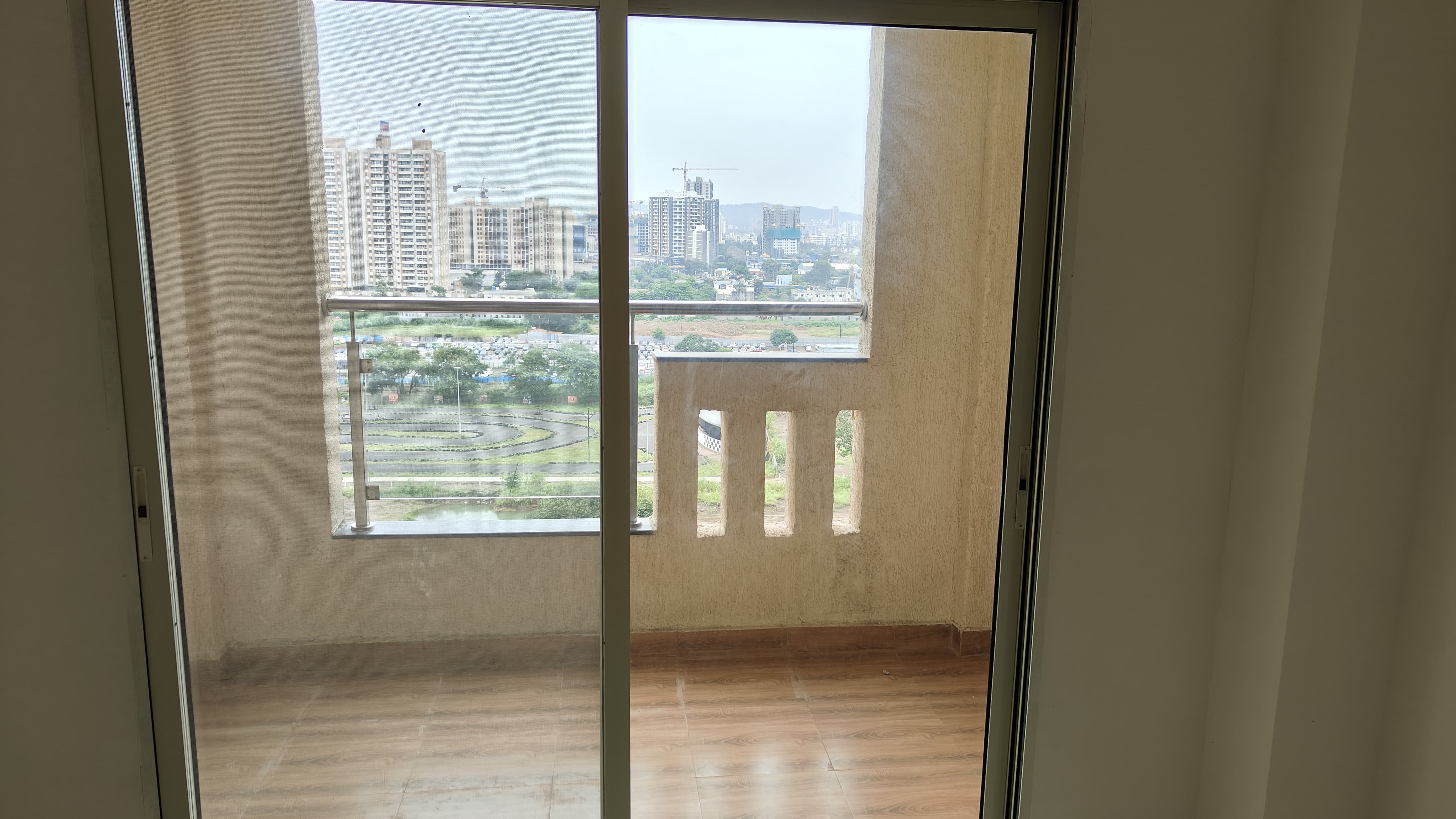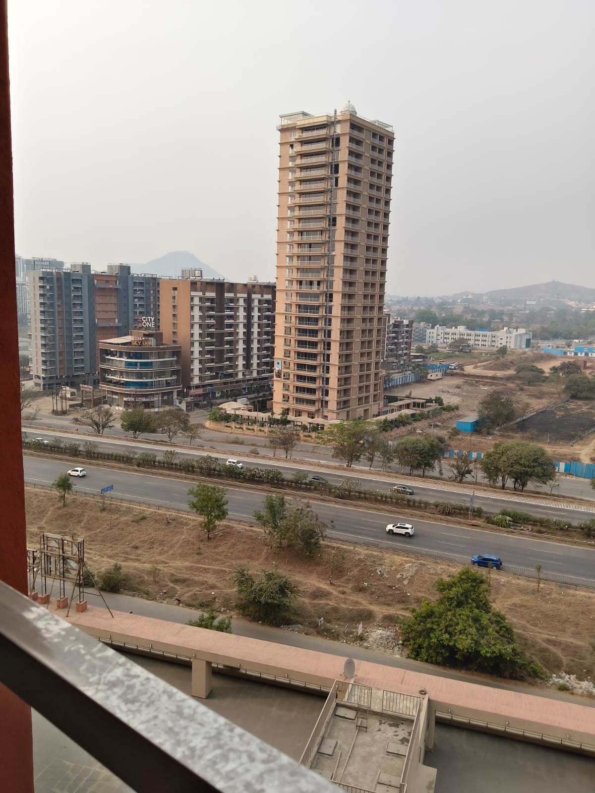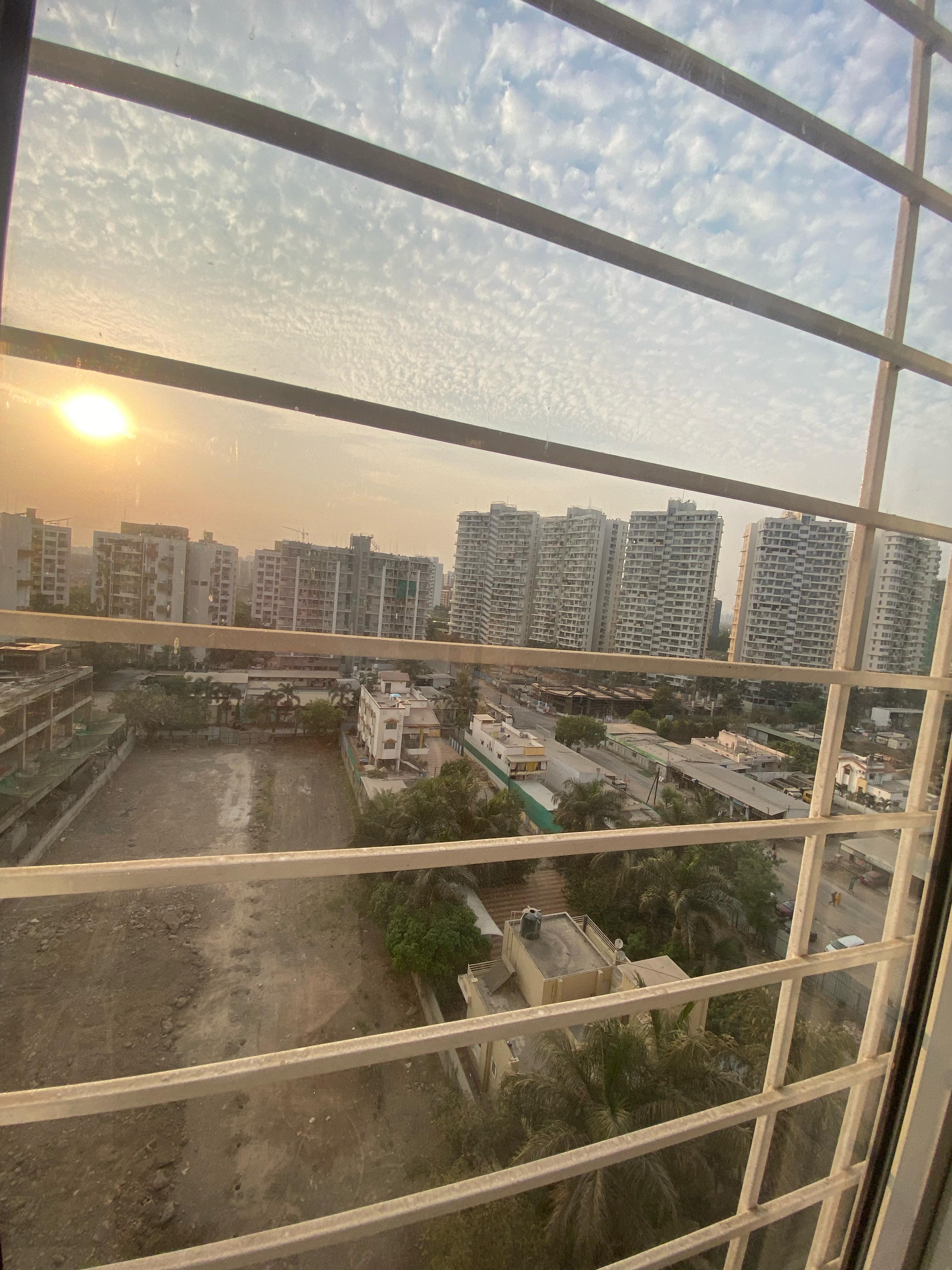 This semi-furnished 2-bedroom Flats in Tathawade, Pune, offers comfortable living with garden views from its ninth-floor balcony.