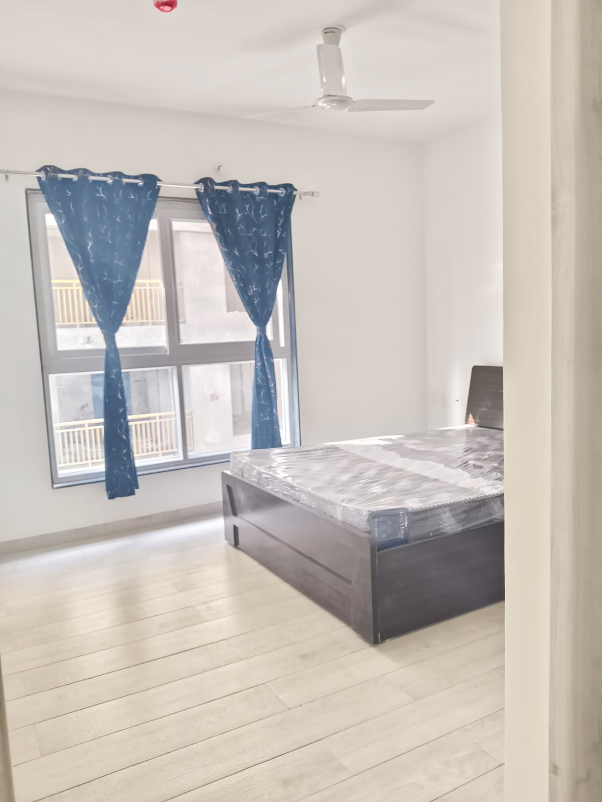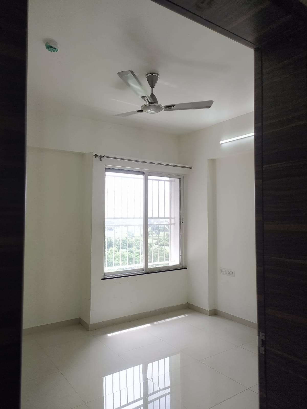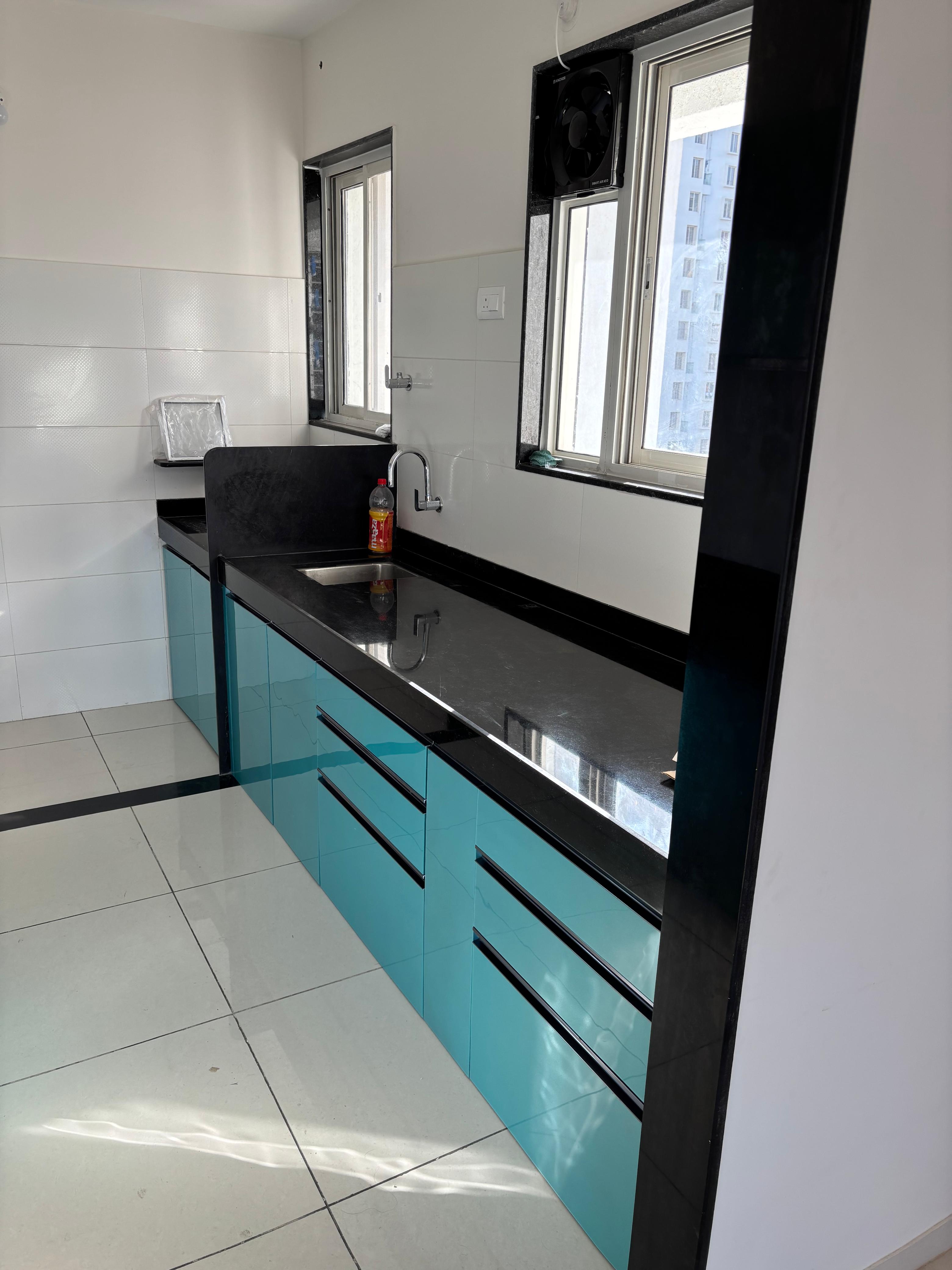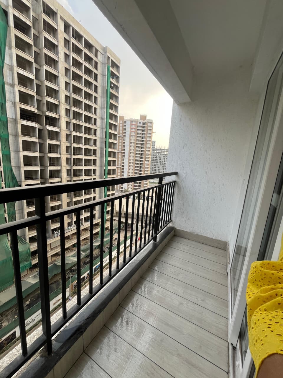 This semi-furnished 2-bedroom Flats in Tathawade, Pune, offers comfortable living with garden views from its ninth-floor balcony.