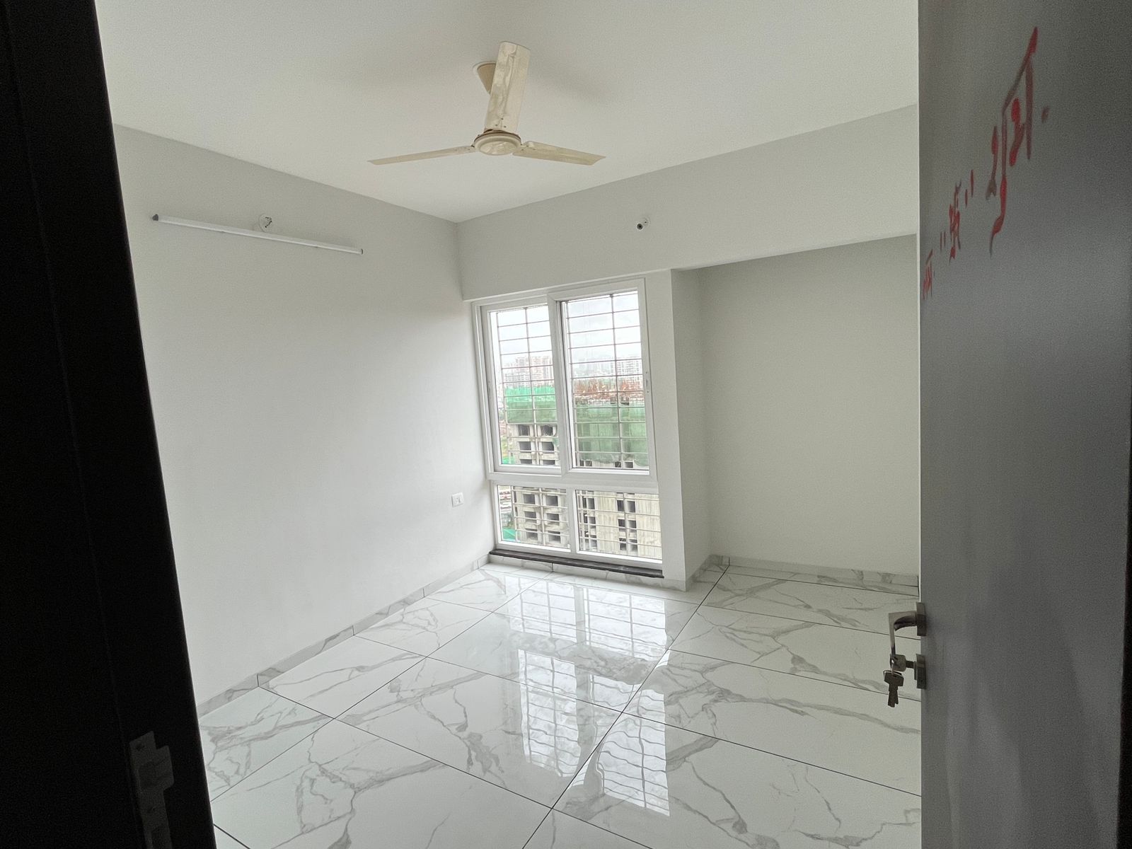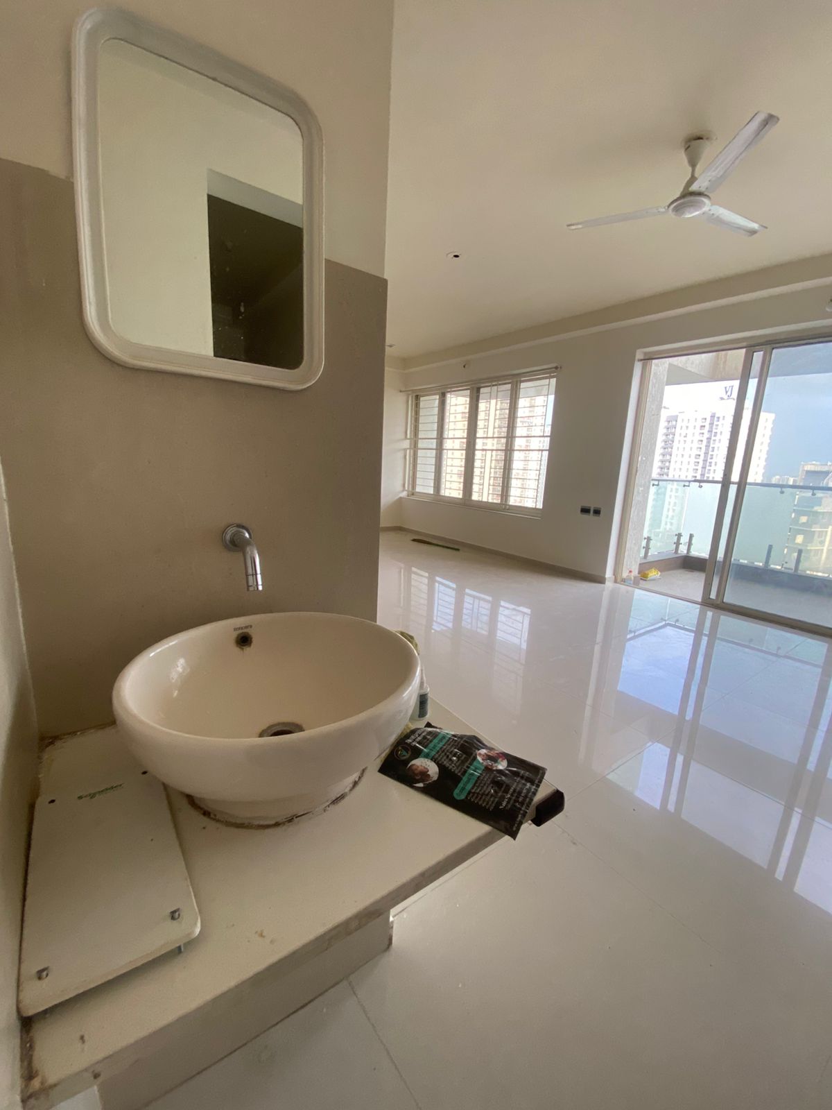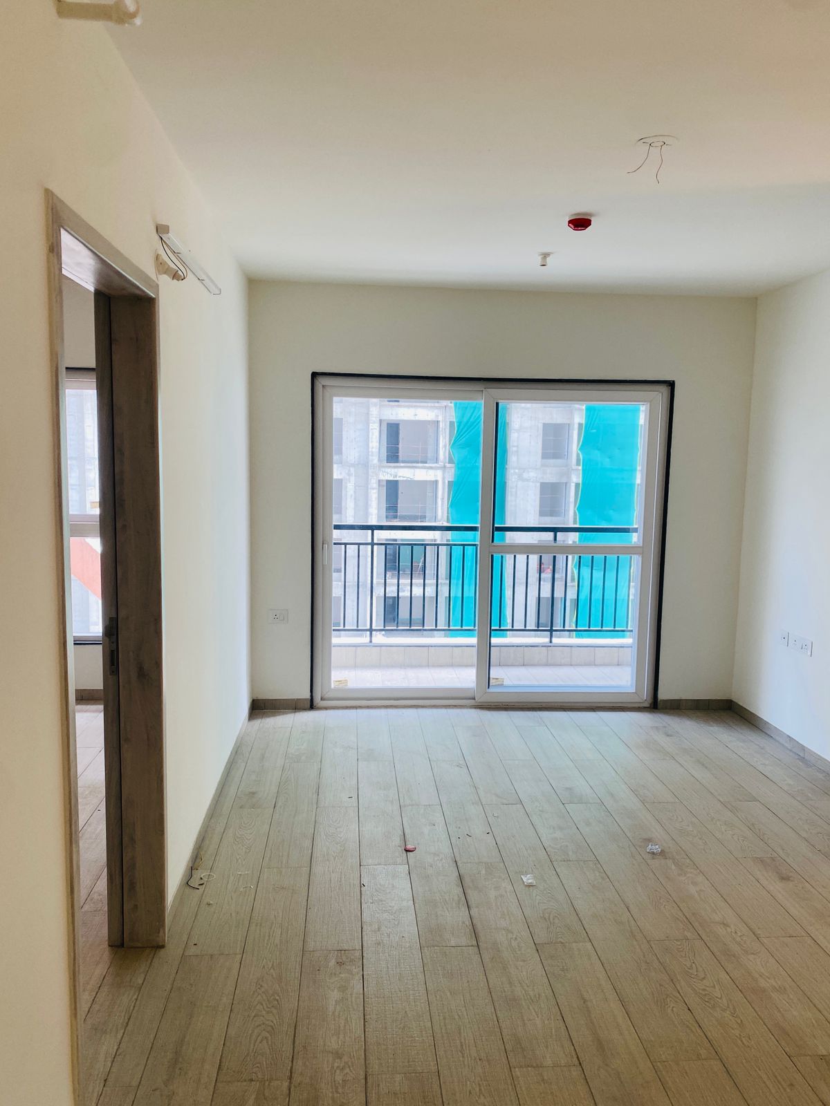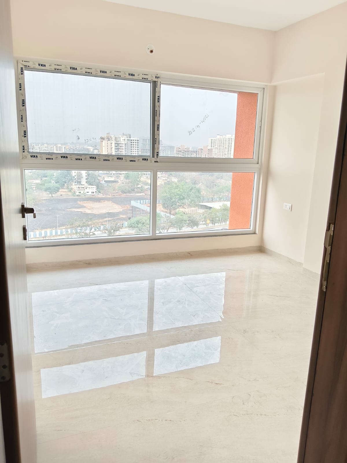 This semi-furnished 2-bedroom Flats in Tathawade, Pune, offers comfortable living with garden views from its ninth-floor balcony.