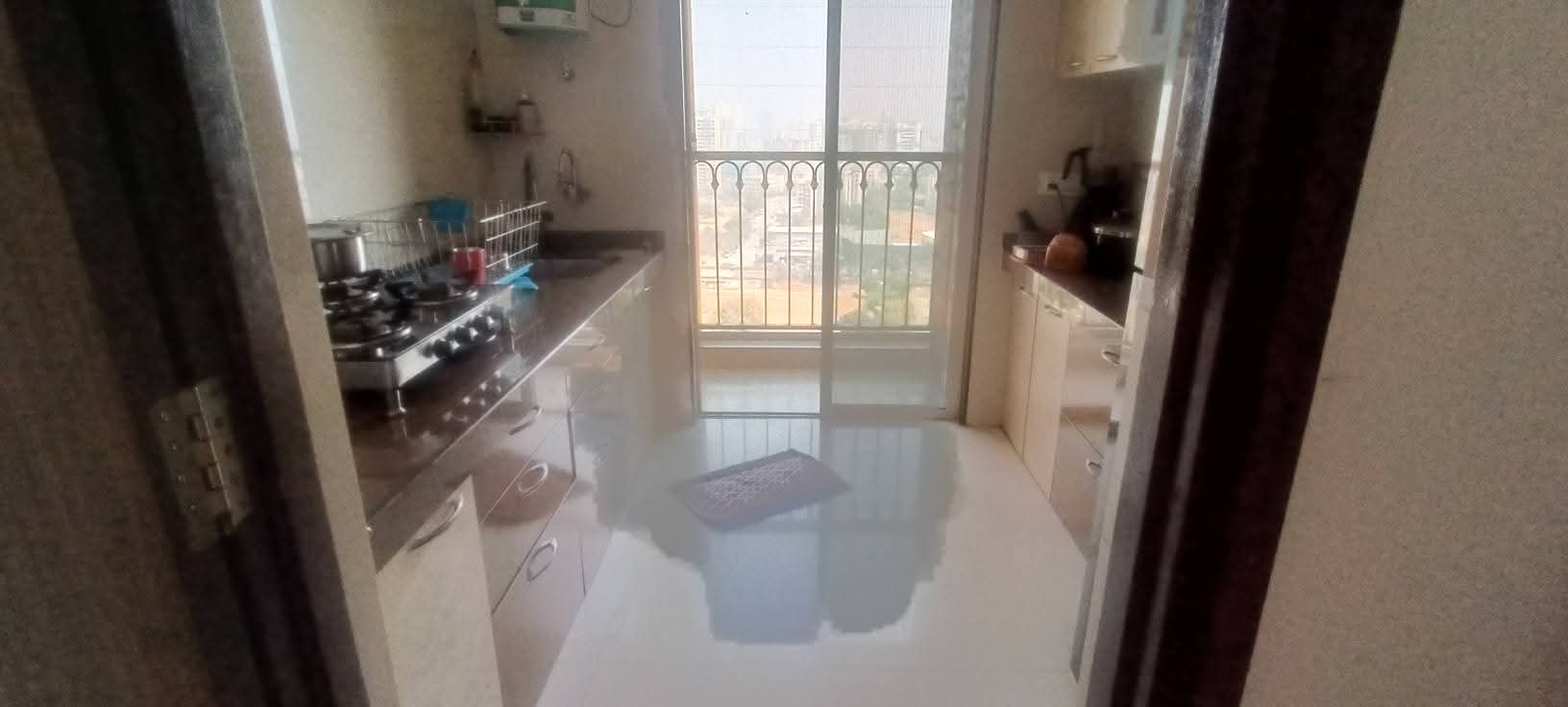 • This semi-furnished 500 square feet home on the 14th floor of the 24-story Lodha Crown Kolshet building offers a