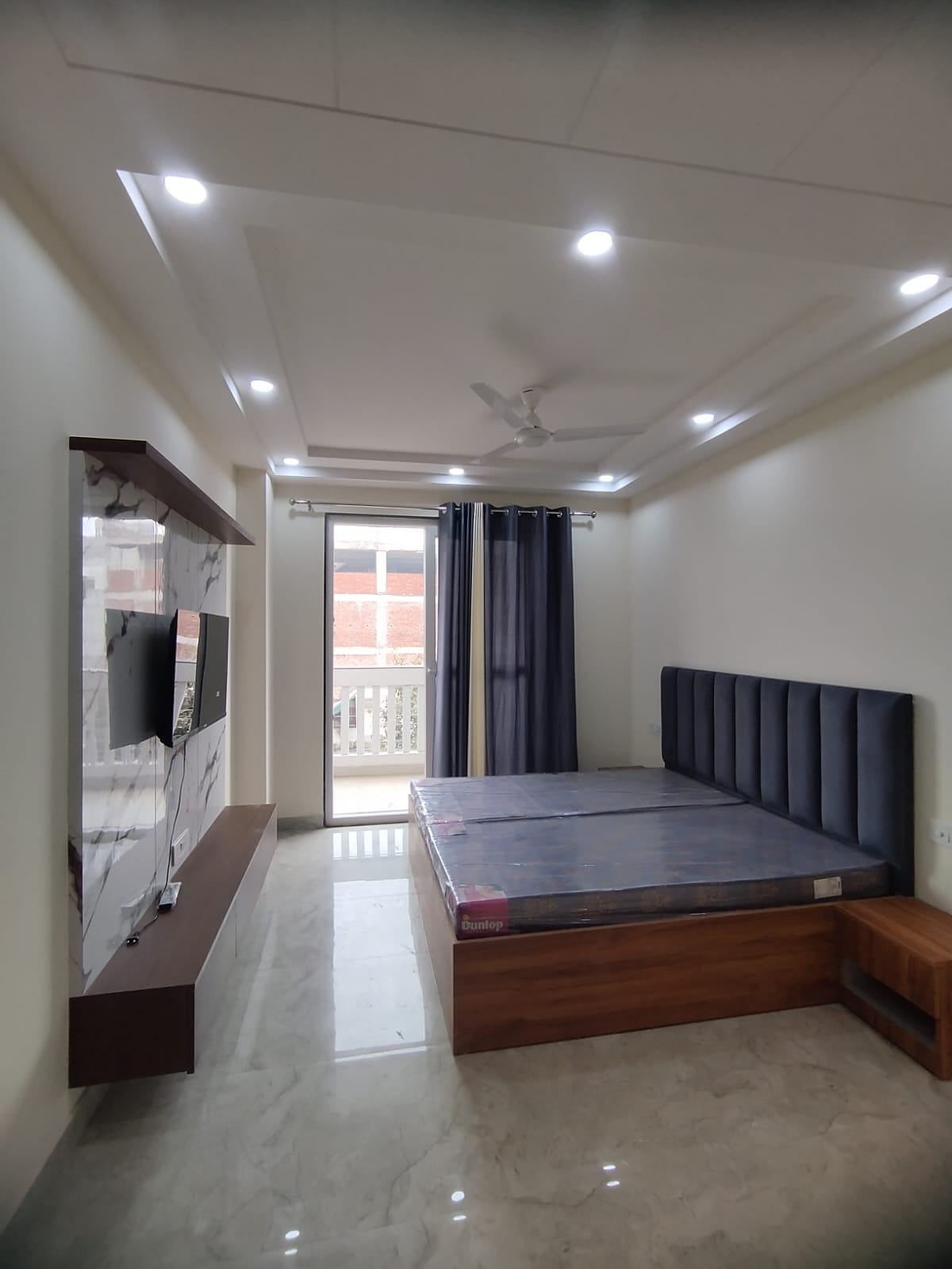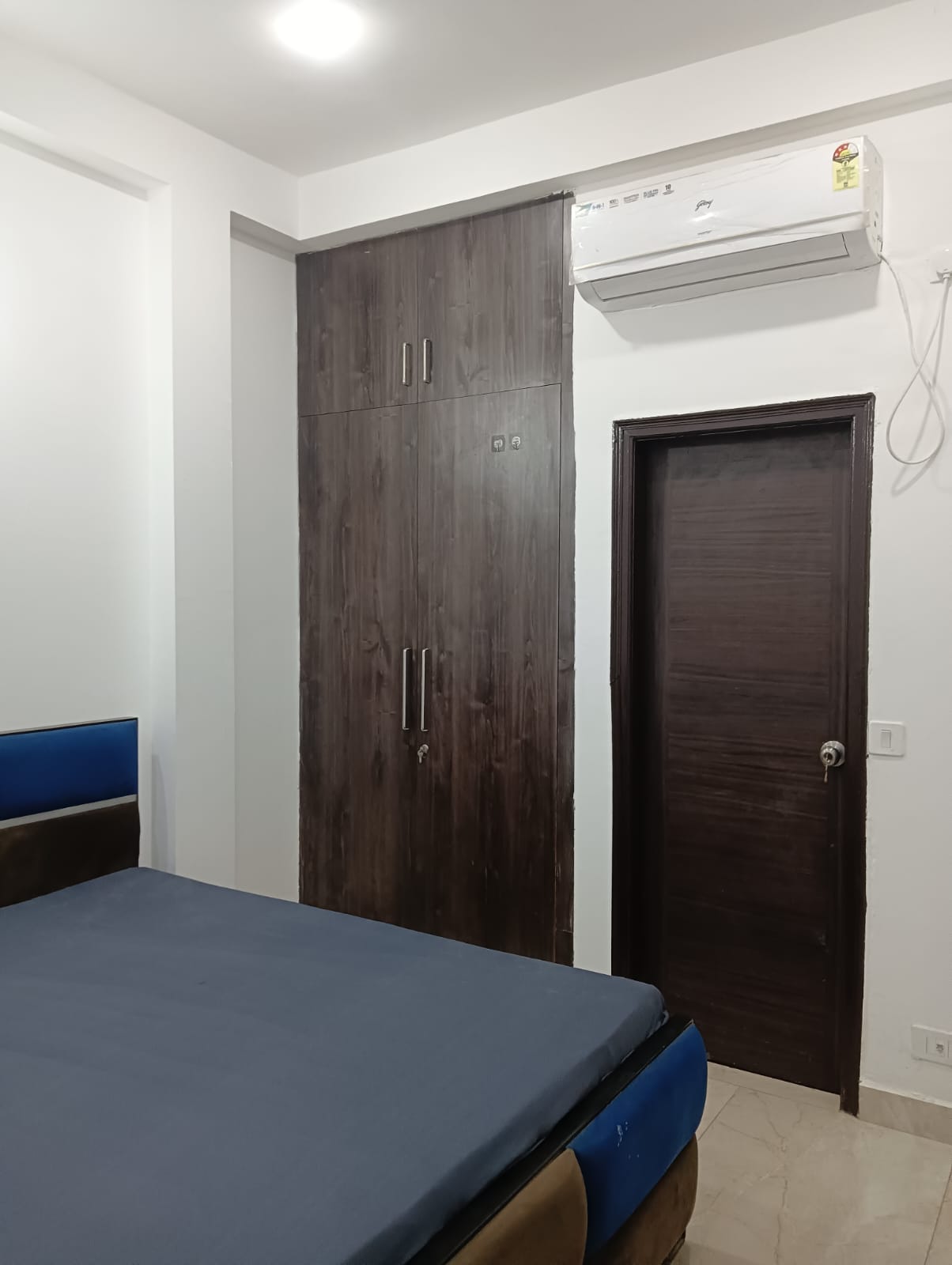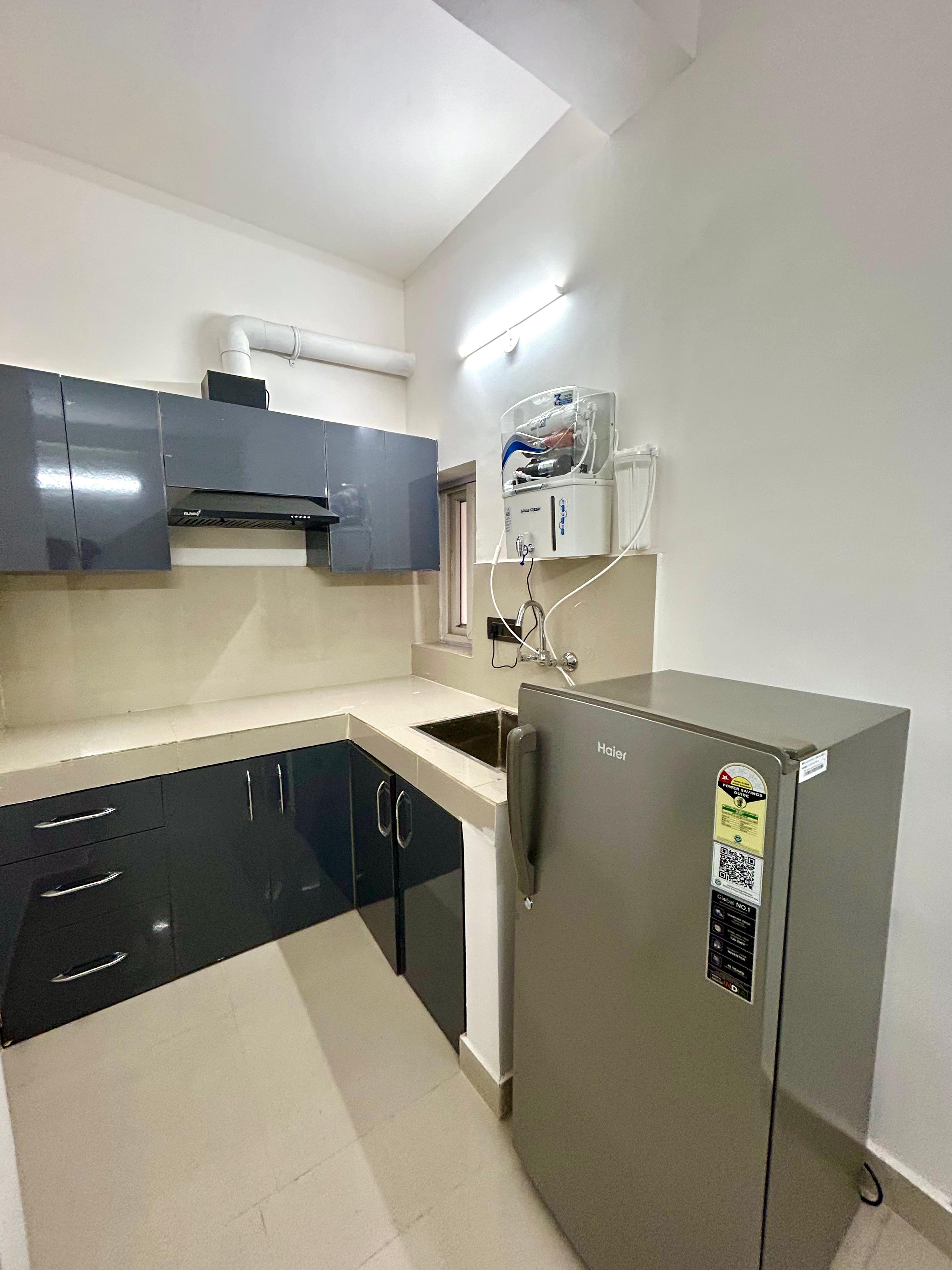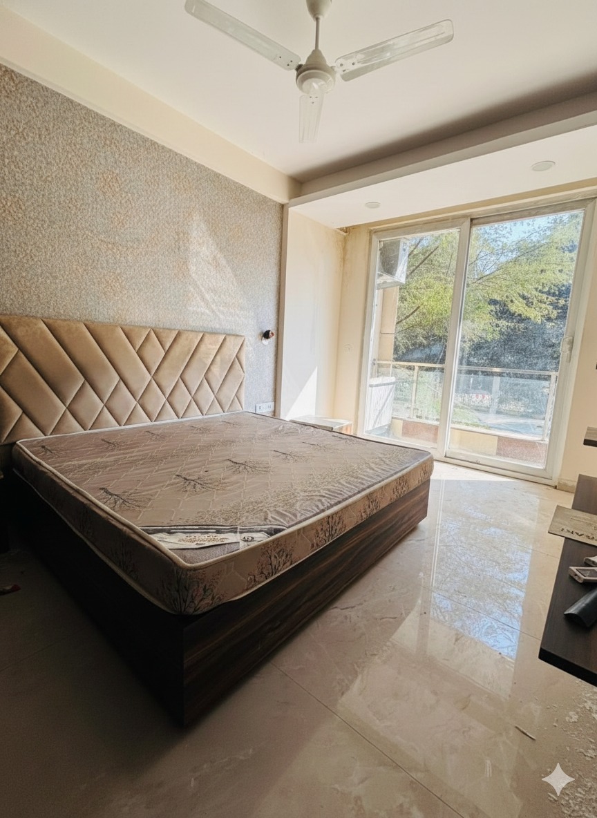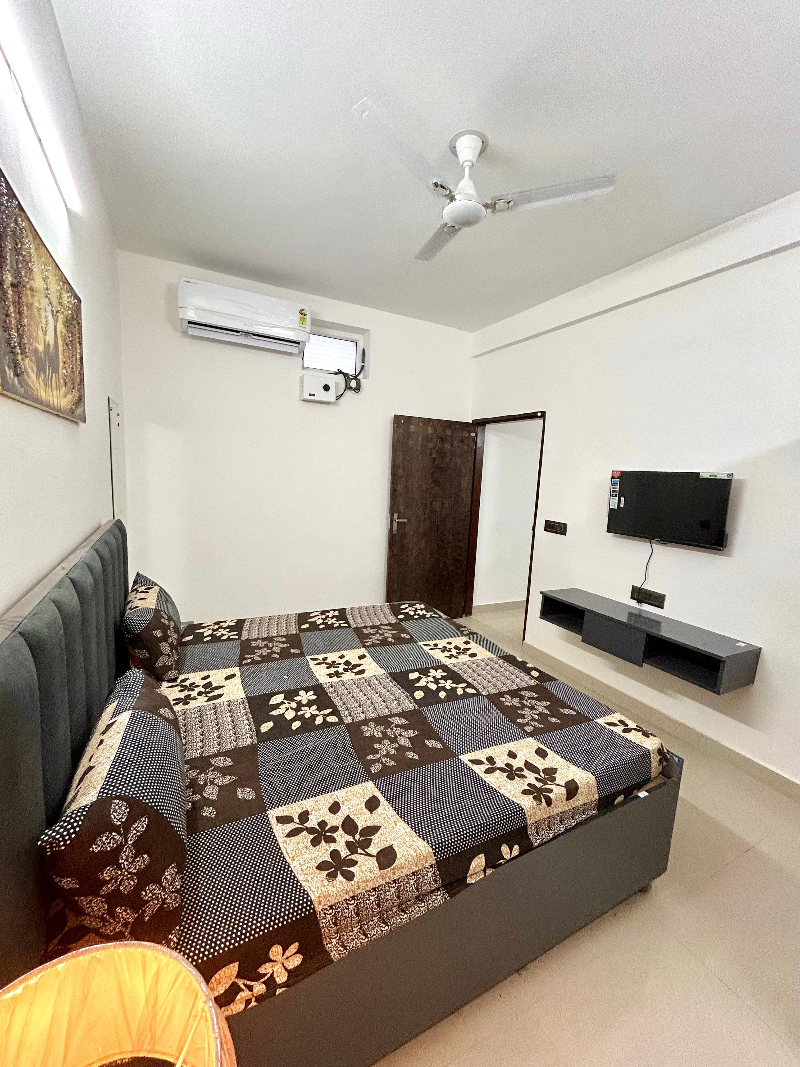 This furnished one-bedroom builder floor in Gurgaon’s Sector 43 offers a comfortable and secure living space with a road view from its balcony.