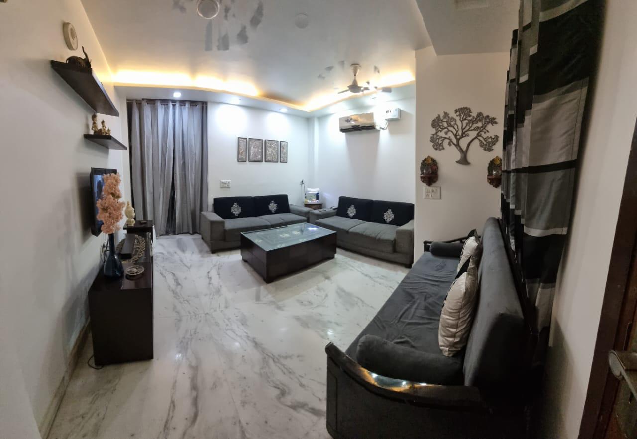 This furnished 3-bedroom, 3-bathroom builder floor in Rajouri Garden, Delhi, offers comfortable living with 160 square yards of space.