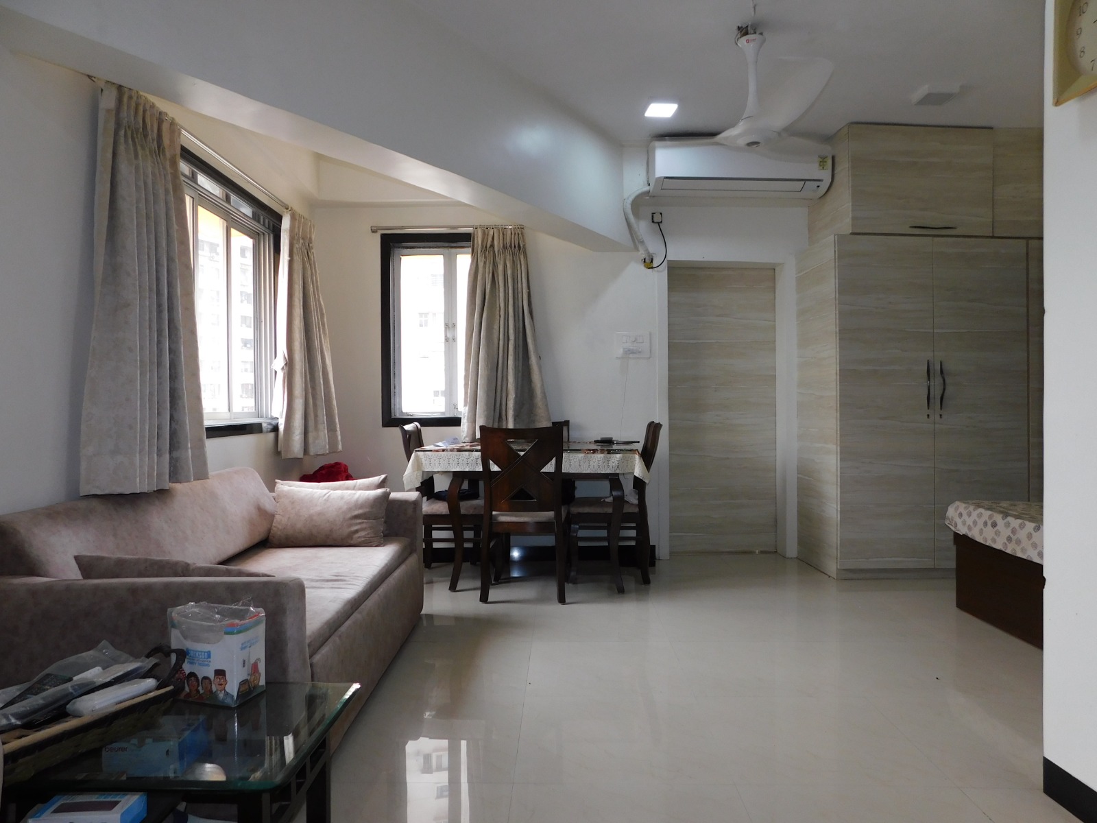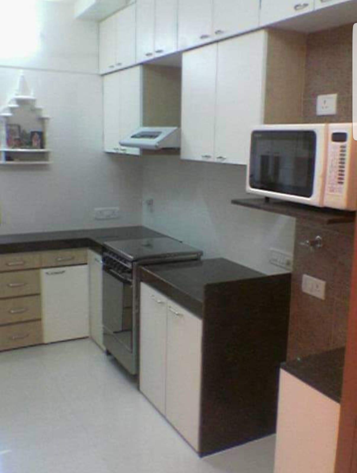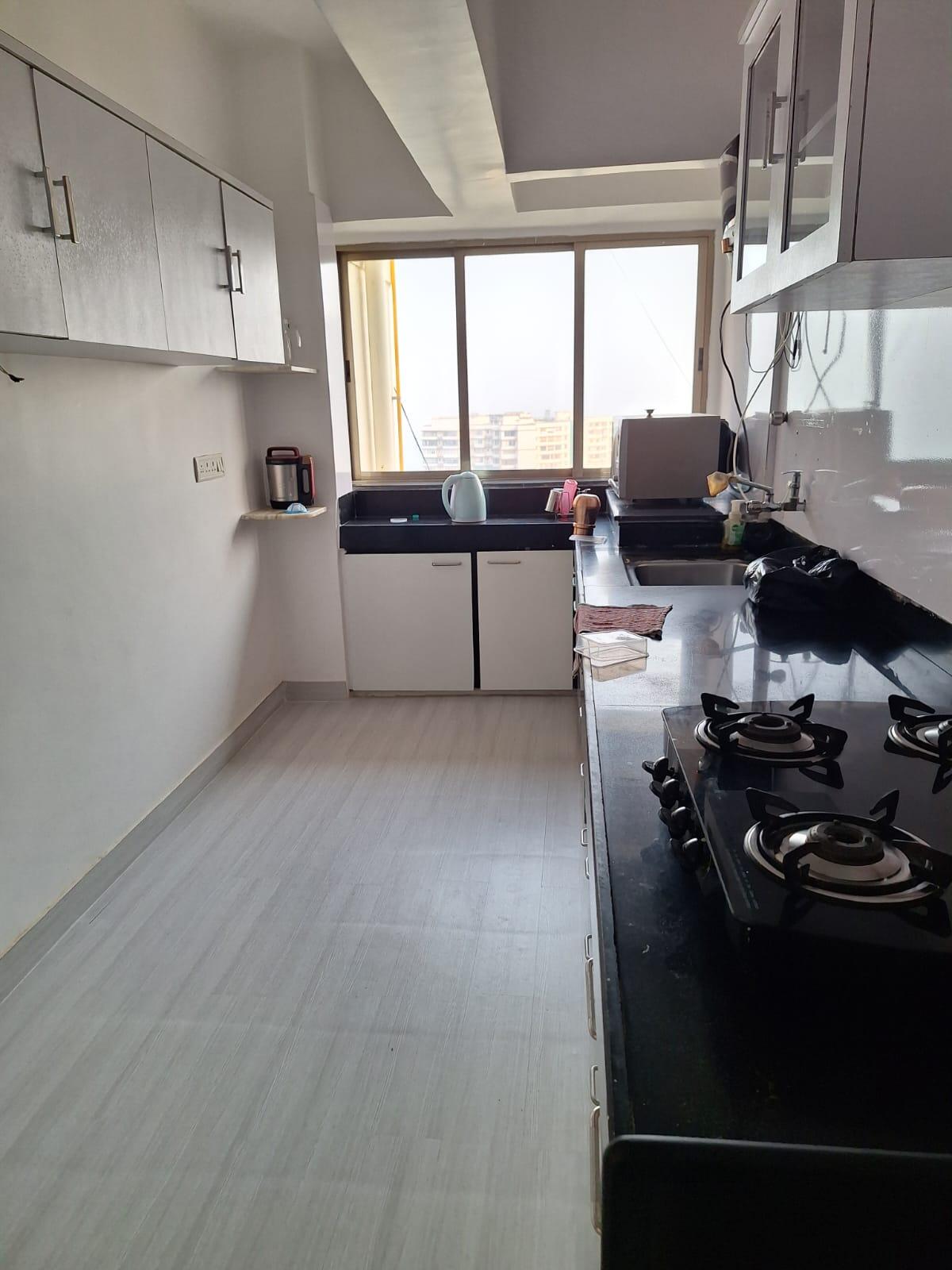 Enjoy expansive sea views from this furnished 2-bedroom, 2-bathroom Flats located on the 15th floor of Victory Flora Headquarters in Shanti Nagar, Mumbai, available for rent.