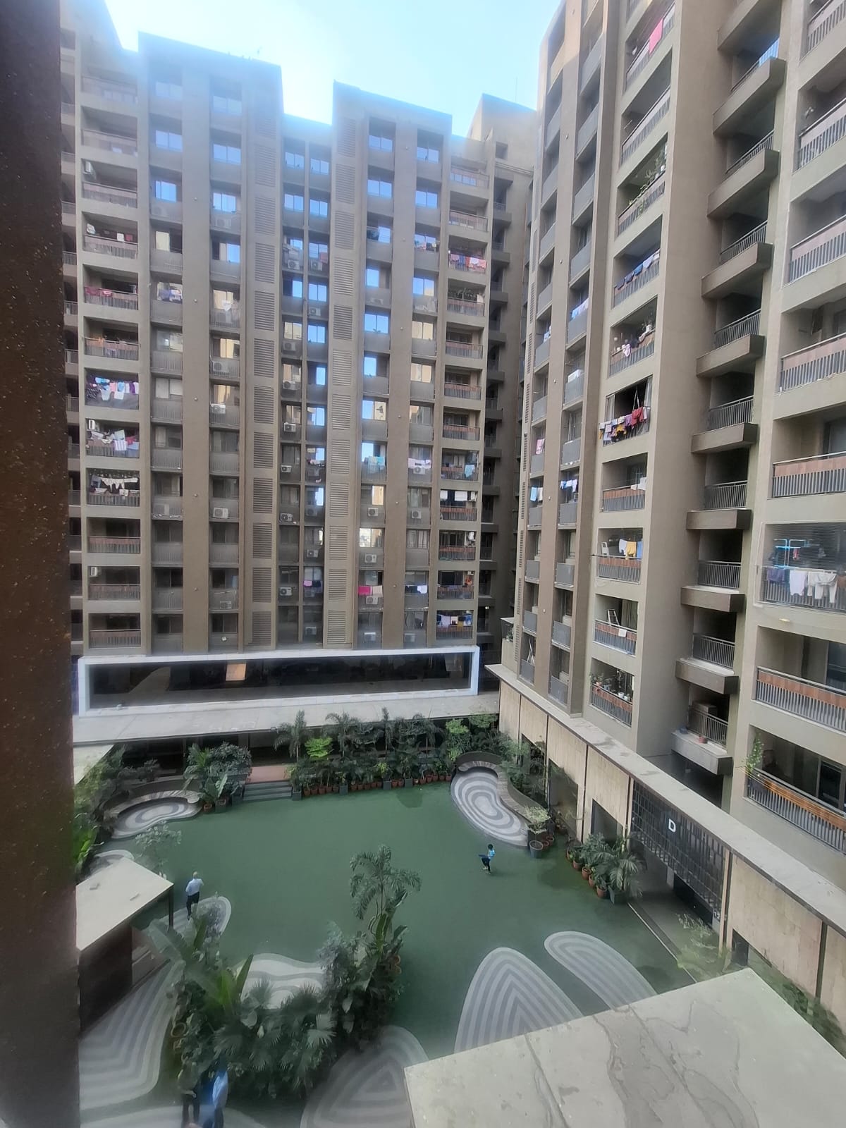 This semi-furnished 3 bedroom, 3 bathroom Flats in Ahmedabad offers a pool view from its 8th-floor balcony and is ideal for bachelors or small families.