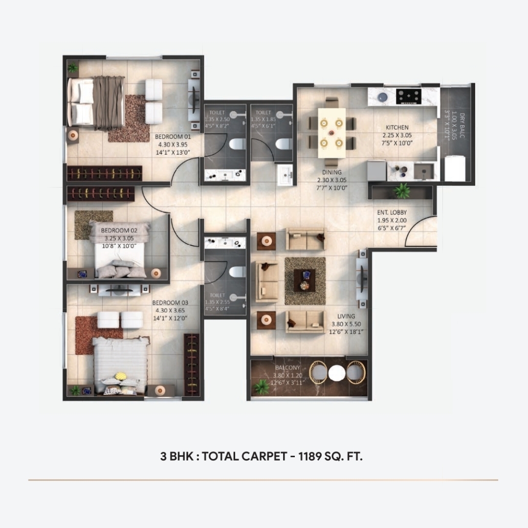 • 1189 Sq.Ft. Carpet Area