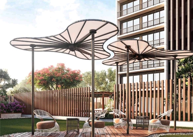 This spacious 5-bedroom, 5-bathroom unfurnished Flats in Vesu, Surat, offers a luxurious lifestyle with its expansive 5800 square feet area and a tranquil garden view from the balcony.
