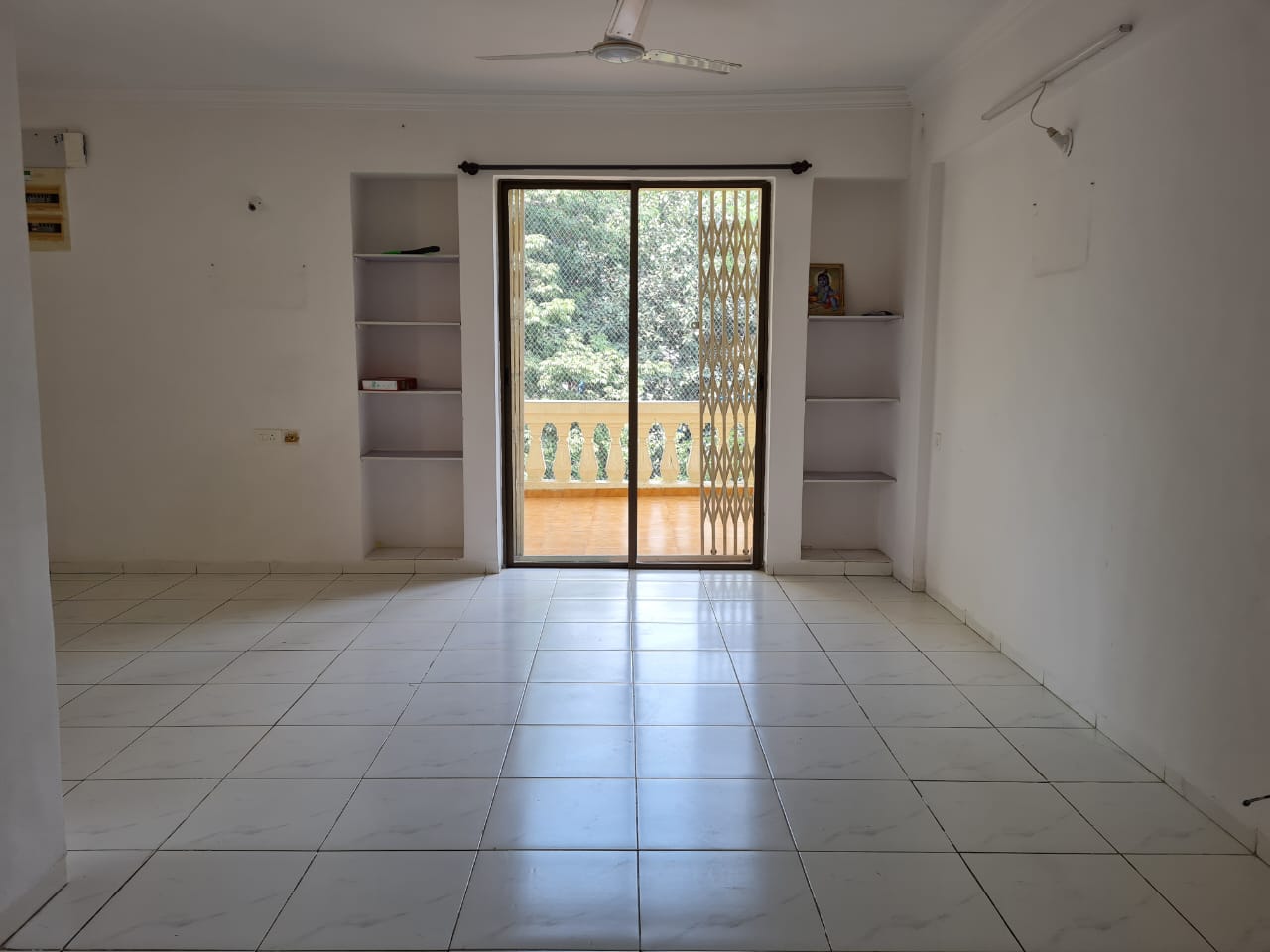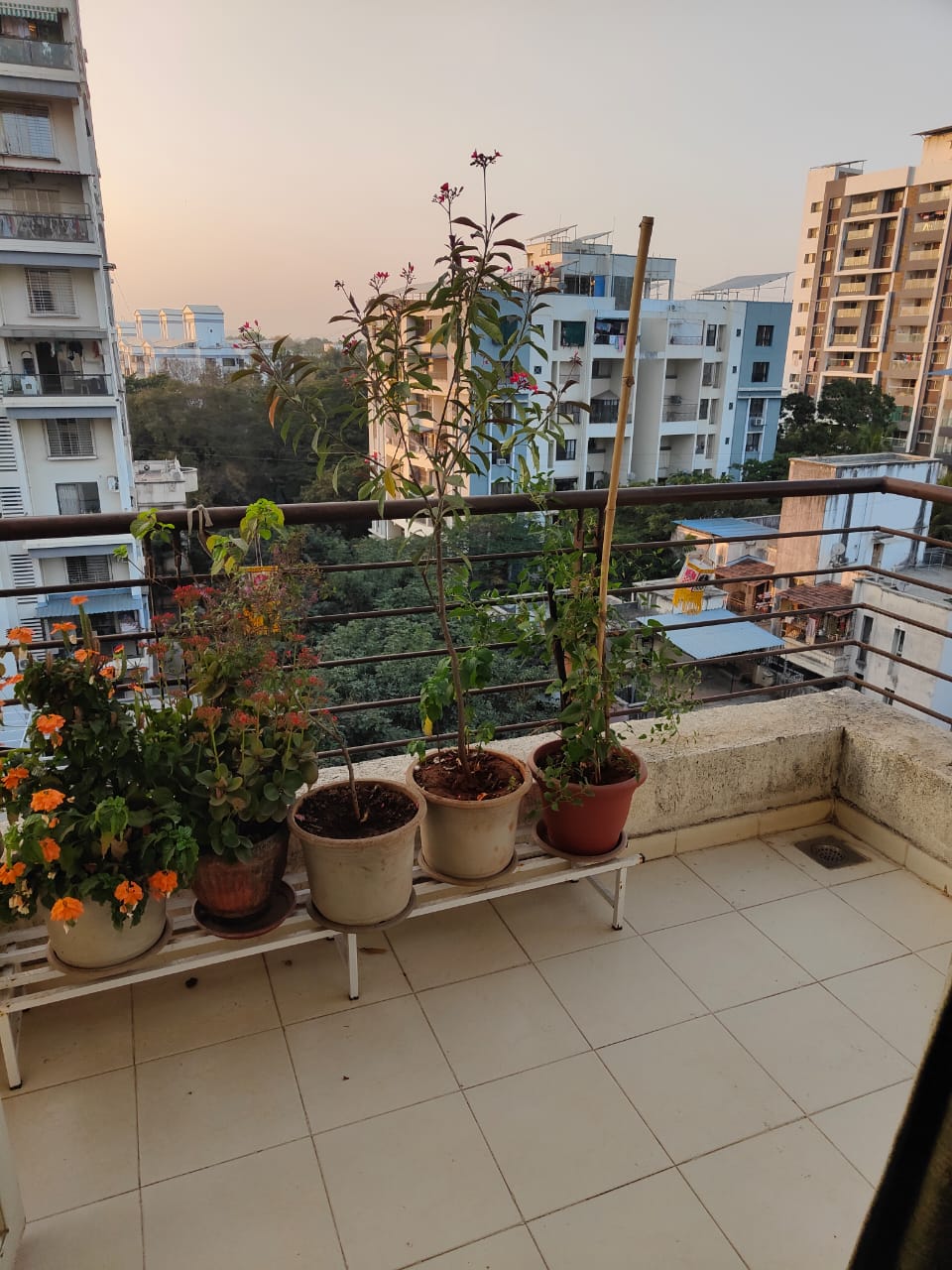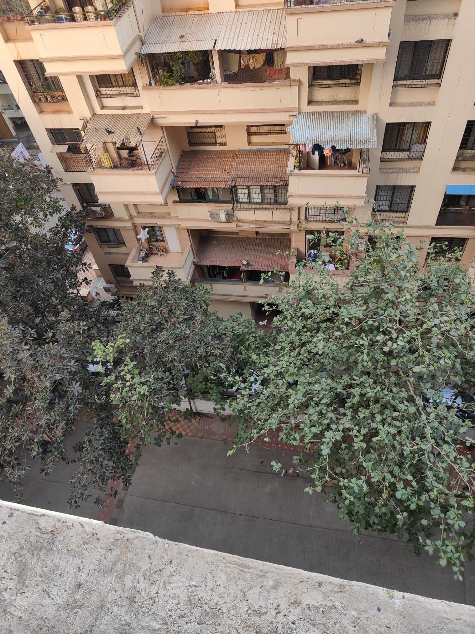 A quiet garden view awaits from the balcony of this 500 square feet, one-bedroom Flats located on the third floor of Naiknavare Trinity Court in Koregaon Park, Pune.