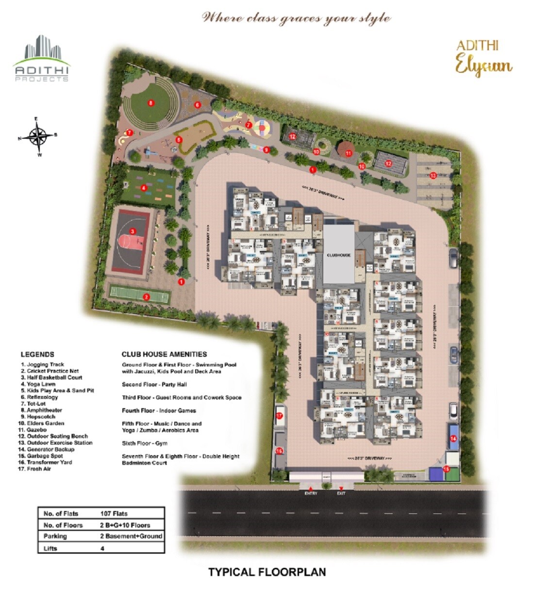 The master plan for Adithi Elysian is designed with a prominent residential building surrounded by extensive open spaces dedicated to various recreational and utility zones. You can clearly see a large area allocated for landscaped gardens, sports courts, and play zones, along with a dedicated clubhouse complex.