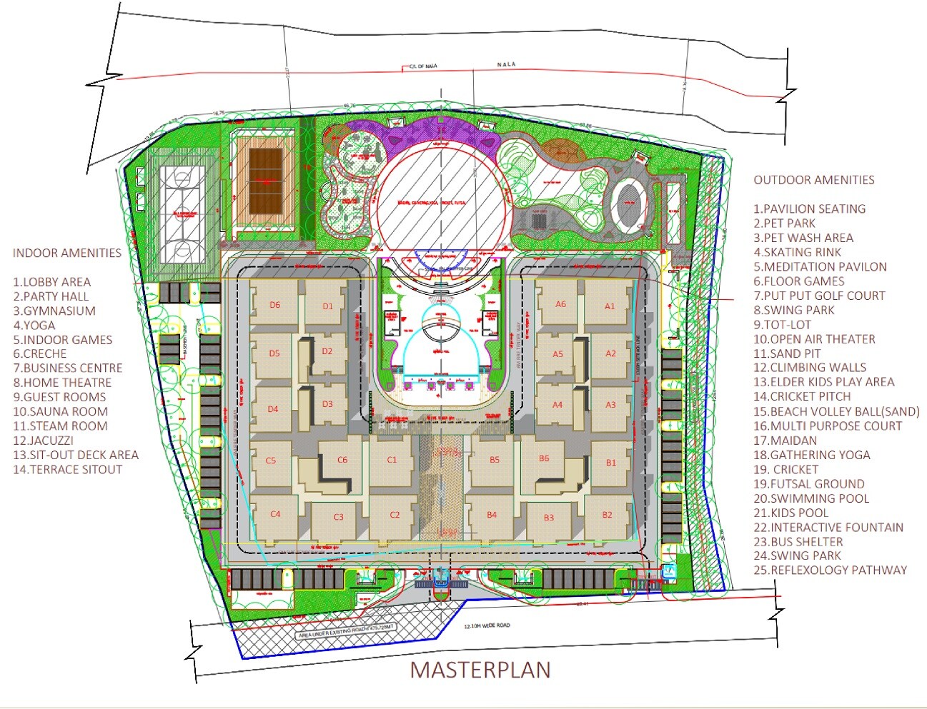 The master plan clearly defines residential zones with four clusters of blocks (A, B, C, D series), integrated with extensive indoor and outdoor amenity spaces. A natural Nala (drainage channel) borders the northern edge of the property, influencing the overall layout.