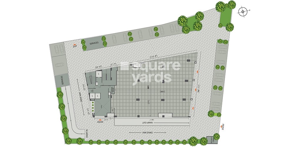 The site primarily features a substantial building structure, which appears to be a commercial or office type given the presence of 'SERVICES' areas. A significant portion of the land is dedicated to vehicular circulation, including wide driveways and parking zones. We also have green, landscaped buffers and planted areas around the perimeter and within the parking facilities, contributing to open space.