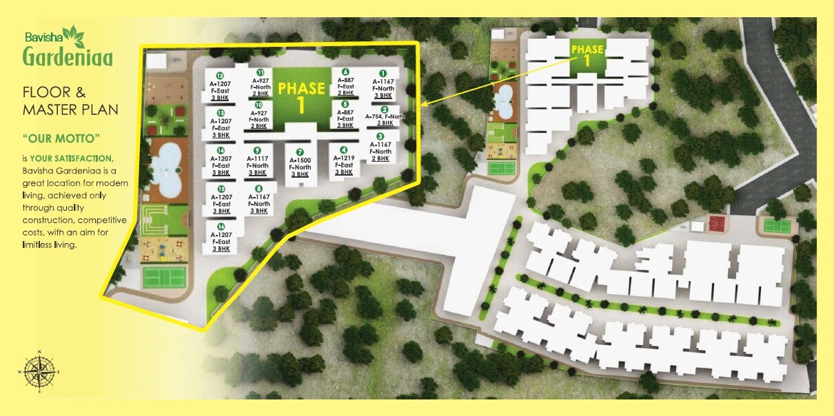 Bavisha Gardeniaa is a residential project located in Somapura. The master plan illustrates a multi-phase development, with Phase 1 clearly delineated and featuring numerous residential blocks offering 2 BHK and 3 BHK unit configurations.