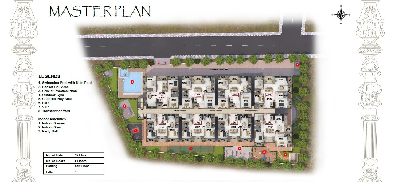 Bhavisha Bilva is a residential complex located in Sarjapur Road, featuring 32 flats distributed across multiple blocks, each with 4 floors. The project includes stilt floor parking.
