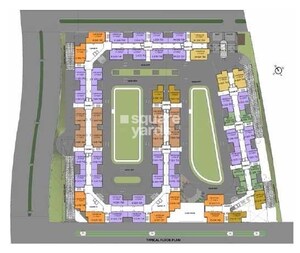 The plan outlines residential blocks concentrated around two central open spaces. An internal road system is integrated to facilitate movement within the property. Specific land use percentages or units per acre are not detailed in these floor plans.