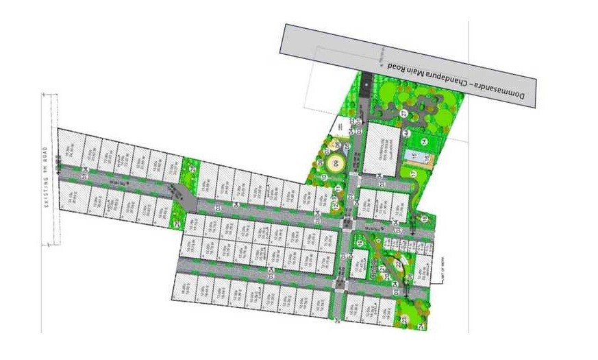 Capstone Circular Reflections is a plotted development located in Kommasandra. It features 74 individual plots within its layout. This master plan does not indicate any multi-story towers, nor does it specify a total land area or project launch and completion dates.
