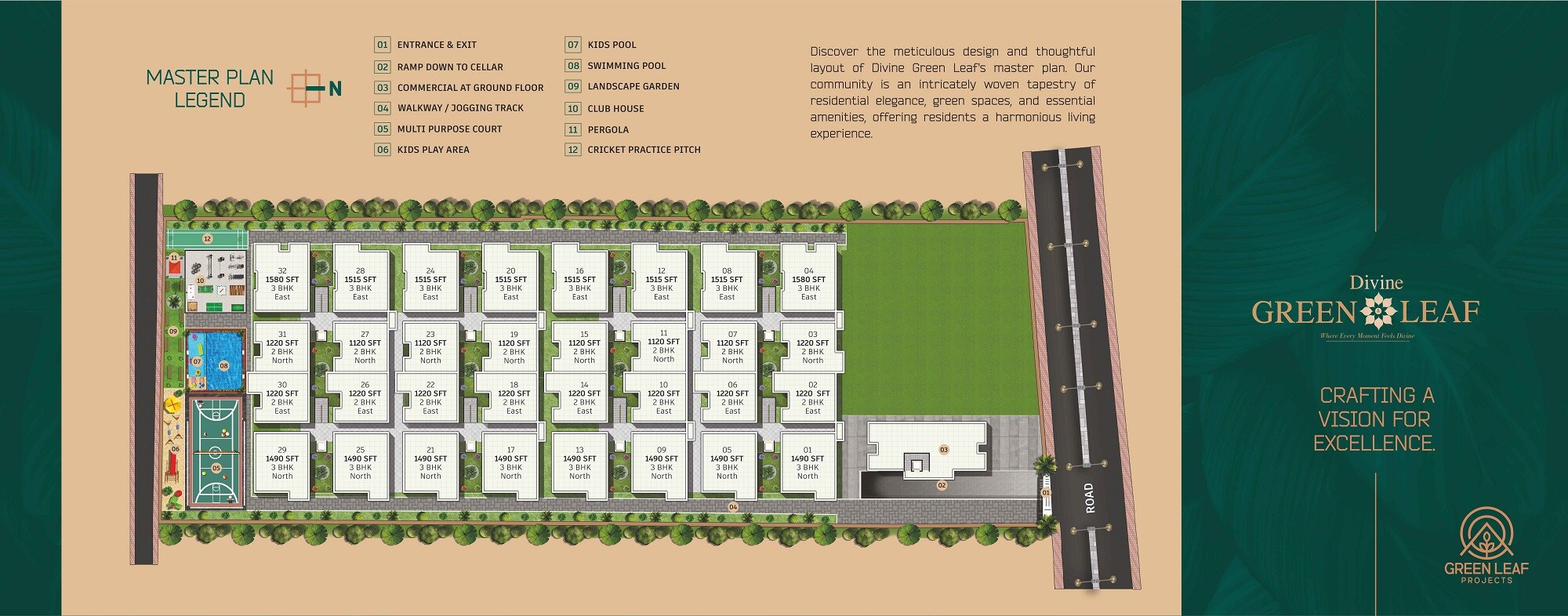 Divine Green Leaf features 32 residential units, primarily villas/townhouses, within a thoughtfully designed master plan. No information regarding total land area or project launch/completion dates is available in the provided plan.