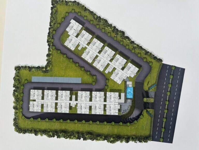 The master plan primarily designates space for residential living, complemented by significant green and open areas. Two blocks of residential units are surrounded by landscaped zones, with clearly defined internal roads. A communal swimming pool area is centrally located near the main entrance.