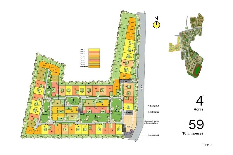 The entire 4-acre property is designated for residential use, accommodating 59 townhouses. These townhouses are categorized into different types: A, B, C, D, E, F, G, and Customized, as indicated by the color-coded legend. This layout provides an approximate density of about 15 townhouses per acre.