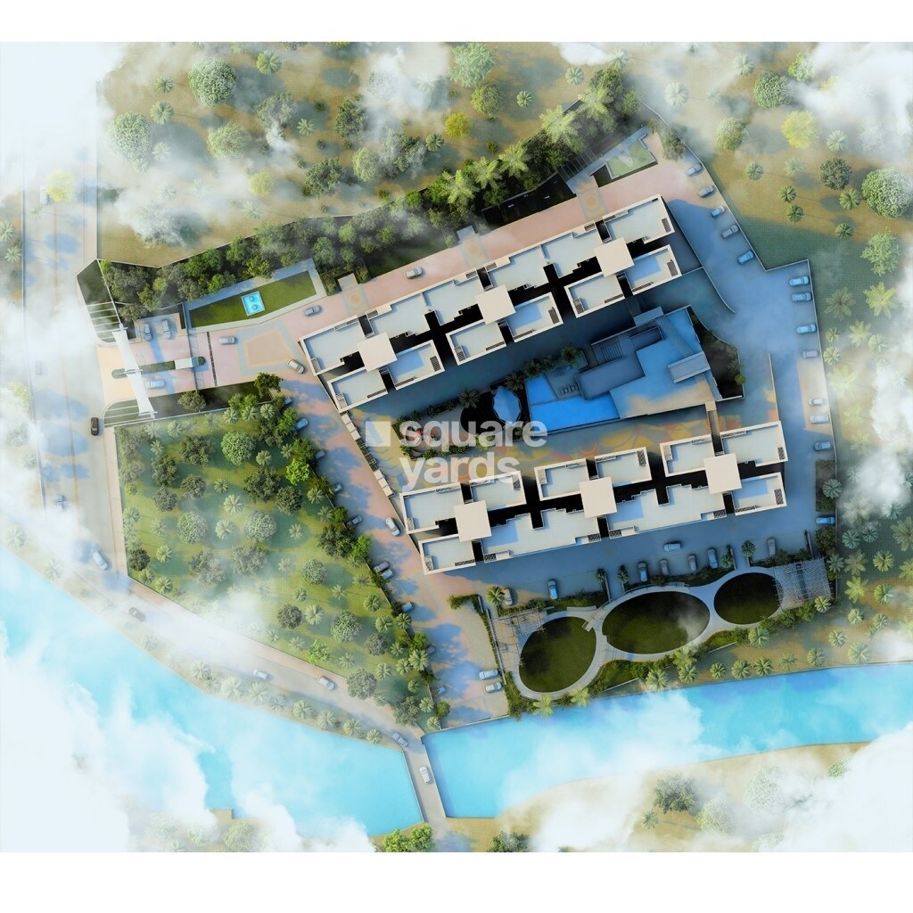 The master plan primarily designates areas for residential use, featuring multiple blocks of individual units. These residential zones are integrated with substantial open green spaces, extensive parking facilities, and amenity areas. A prominent water body borders a significant portion of the property.