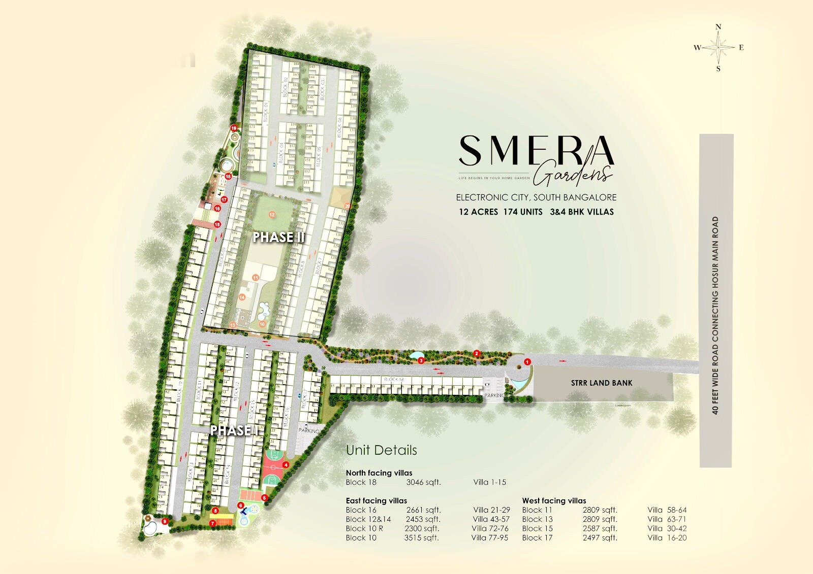 The land is primarily utilized for residential villas, organized into distinct blocks across two phases, Phase I and Phase II. The layout incorporates numerous green spaces and landscaped areas, aligning with the 'Gardens' theme. With 174 units on 12 acres, the density is approximately 14.5 units per acre.