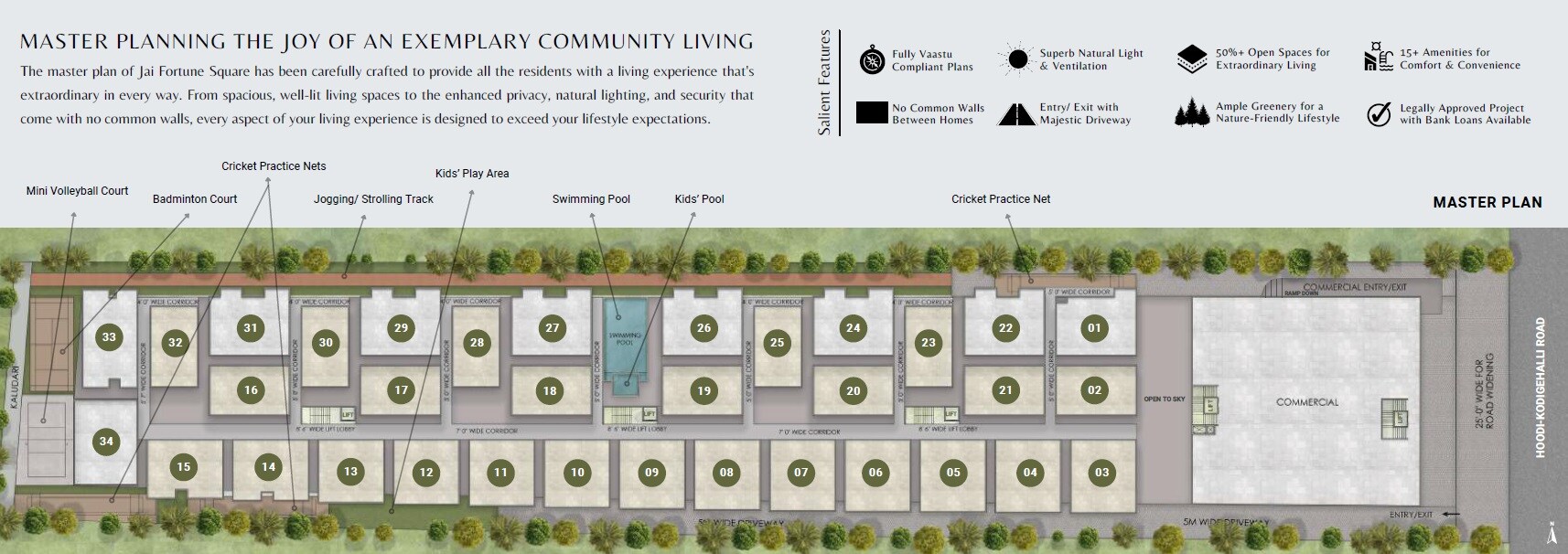The master plan allocates significant space for residential living and amenities, with over 50% of the project area designated as open spaces for residents. There's also a dedicated commercial area within the development.