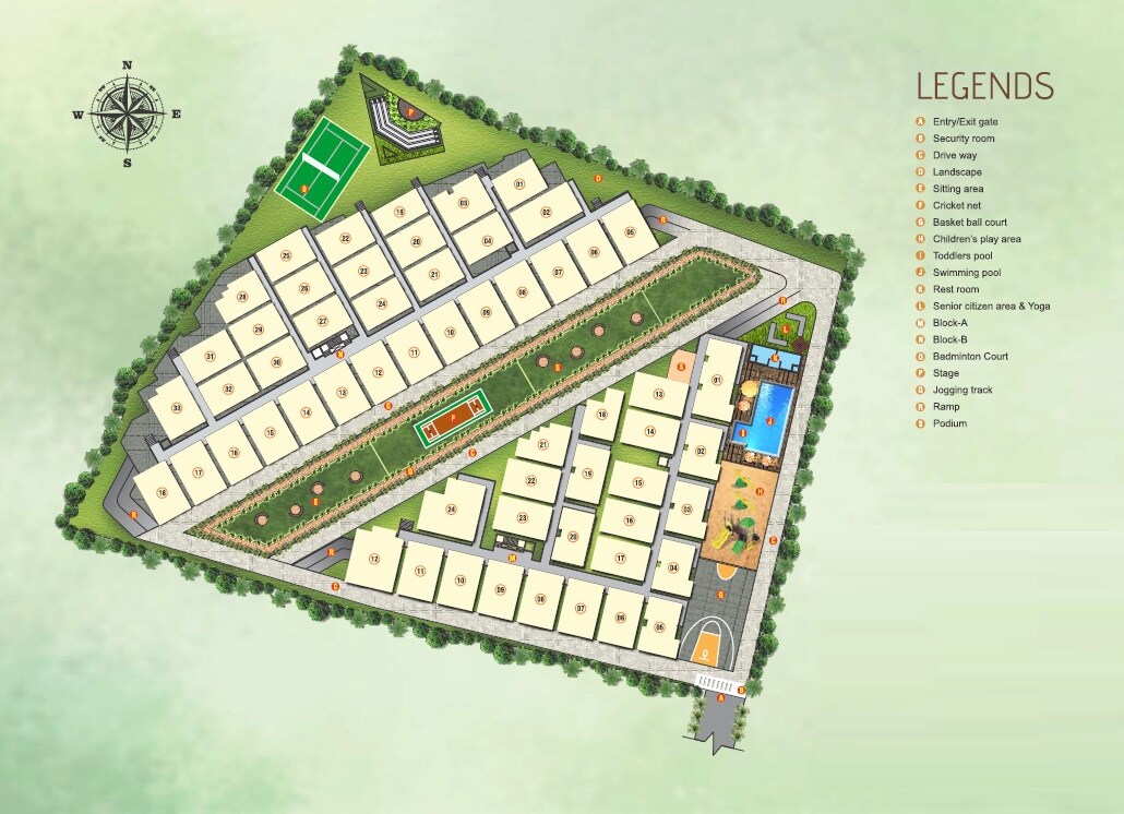 The master plan designates distinct areas for residential plots, open landscapes, and various recreational facilities. Residential areas are organized into 'Block-A' and 'Block-B', each comprising individual plots. Significant portions of the development are dedicated to green spaces, including multiple landscaped areas and sitting spots, promoting a low-density living environment. Recreational zones are centrally located and scattered throughout to provide easy access to amenities for residents.