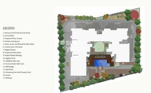 This master plan shows a significant residential building surrounded by various outdoor recreational and green spaces. Most of the area is dedicated to a comfortable residential experience, enhanced by extensive amenity zones and landscaped areas. Specific land use percentages aren't detailed on the plan.