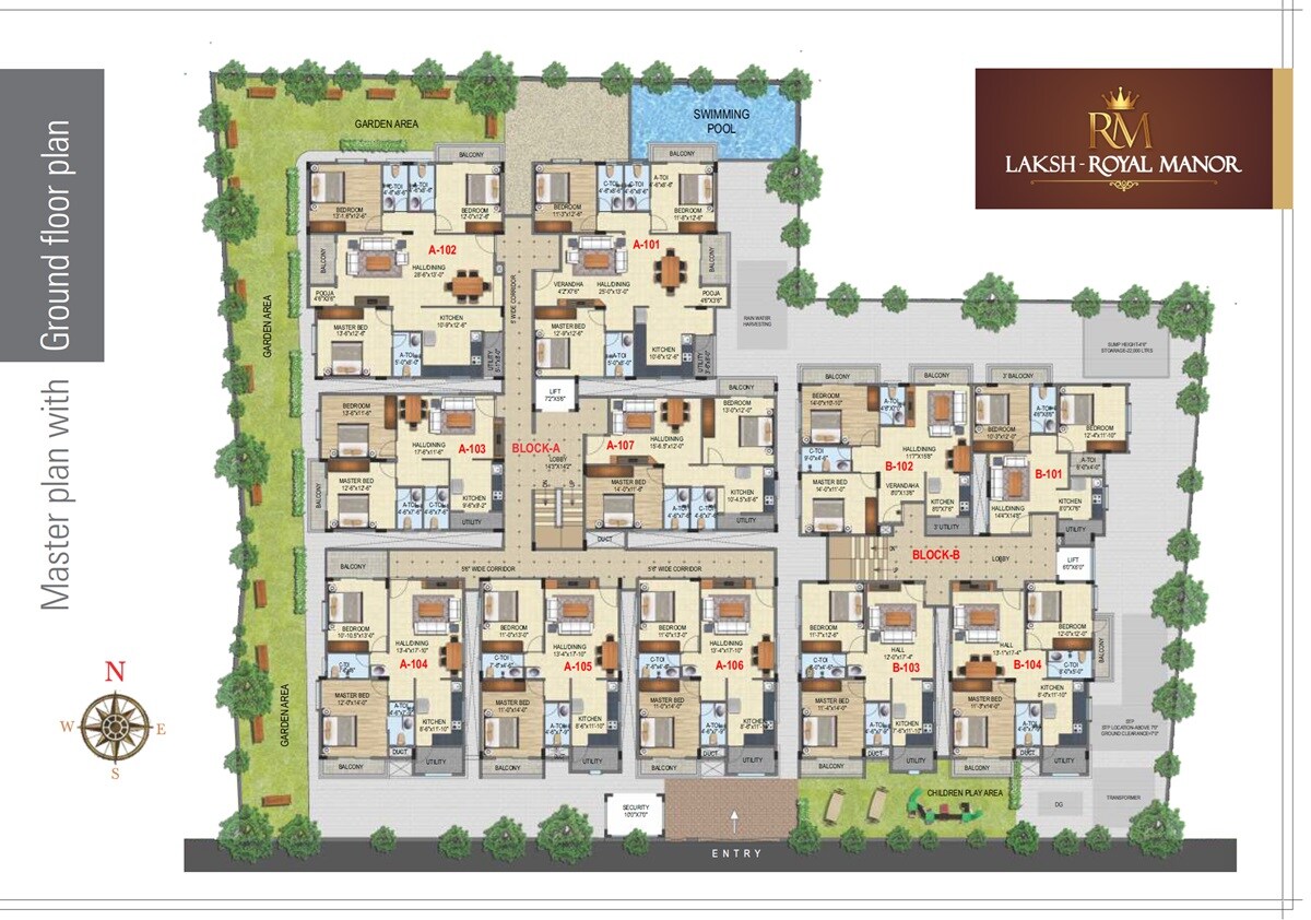 Laksh Royal Manor comprises two distinct residential blocks, Block A and Block B. This ground floor plan illustrates 11 apartment units, with 7 units located in Block A and 4 units in Block B.
