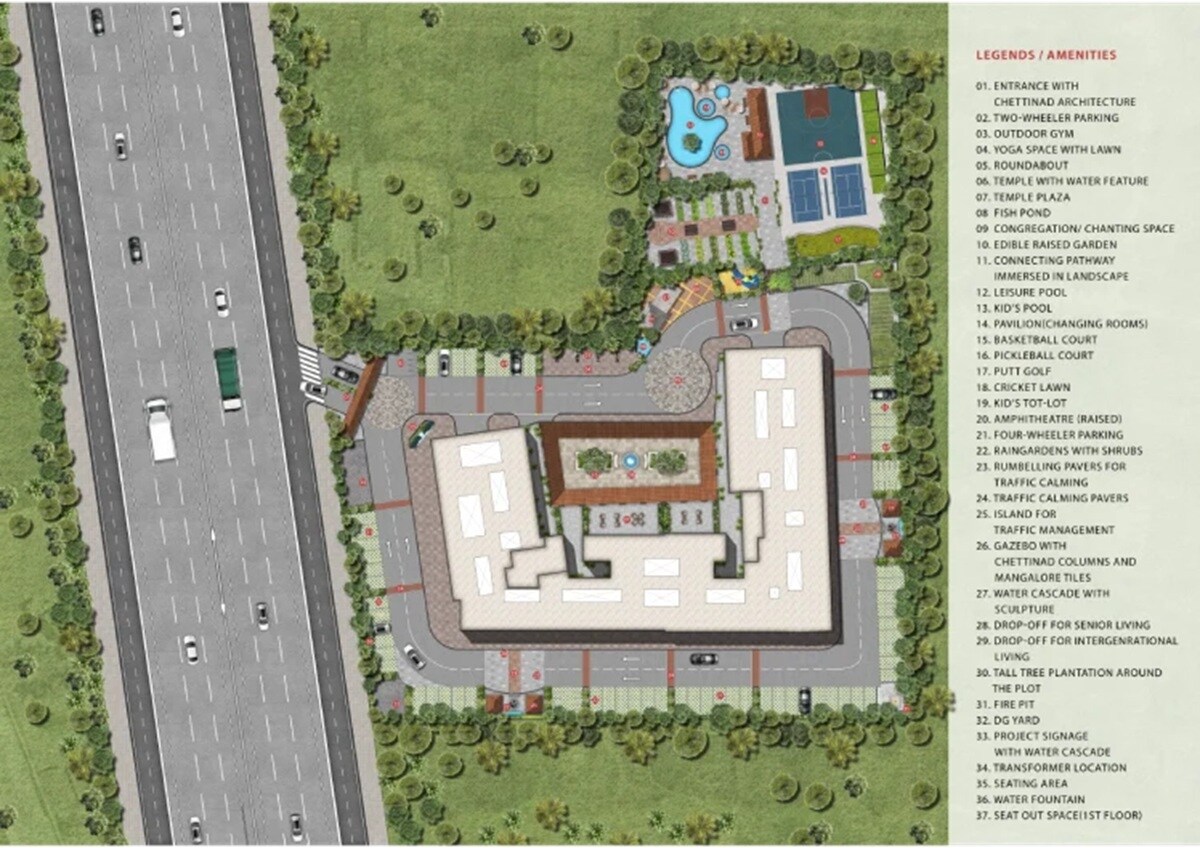 The master plan clearly allocates space for a central L-shaped residential building. A significant portion of the development is dedicated to open spaces, including lawns, gardens, and recreational facilities. The amenity areas are strategically placed around the residential block, with parking integrated within and around the complex. The precise allocation percentages or units per acre are not specified in the visible plan.