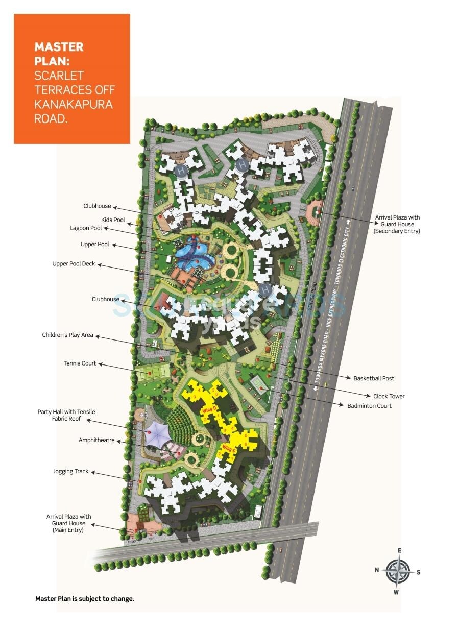This is the master plan for Purva Scarlet Terraces, located off Kanakapura Road. The detailed plan shows the layout of the residential development, but it doesn't specify the total land area, number of units, or number of towers, nor does it provide launch or completion dates.