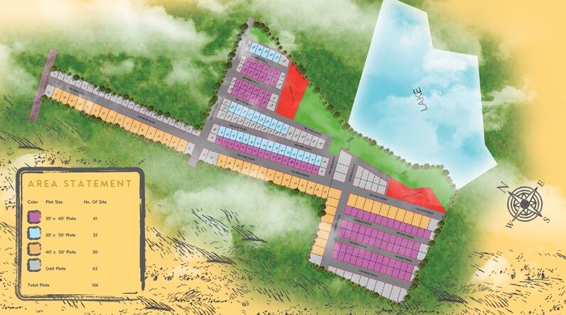 The master plan primarily designates residential plots, categorized by size, alongside a significant natural lake feature. There are no explicit commercial zones identified.
