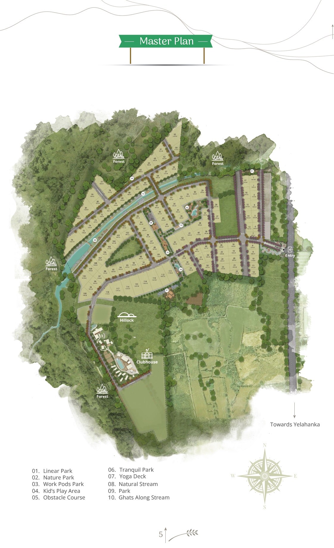 The development integrates residential plots with extensive green spaces. Designated zones include individual residential plots, forest areas along the periphery, a central natural stream, and multiple themed parks designed for various activities.