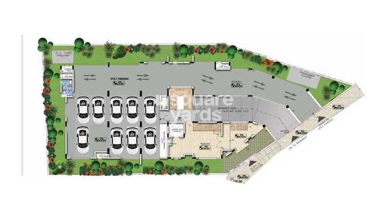 The ground level is primarily utilized for stilt parking, surrounded by extensive green landscaped zones. Key service areas are integrated within the building footprint. Specific allocations or percentages for these zones are not detailed on this plan.