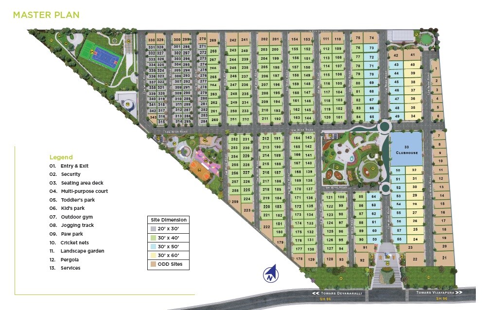 Sattva Bhumi is a plotted development located in Devanahalli. It is well-connected by Bellary Road (6.0 km) and Dabaspete Hosur Highway (8.5 km). The master plan details a community with plot numbers ranging from 1 to 343.