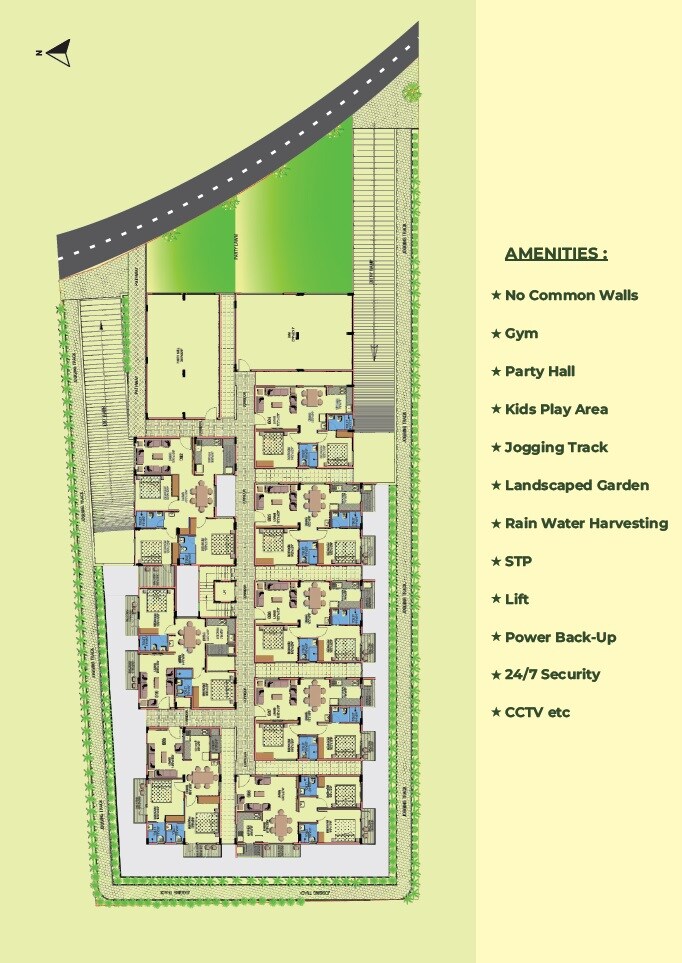 The master plan designates significant areas for residential units, along with visible allocations for external surface parking, internal access driveways, and green open spaces. These open spaces include a landscaped garden, a kids' play area, and a jogging track. The property is bordered by a main external road.